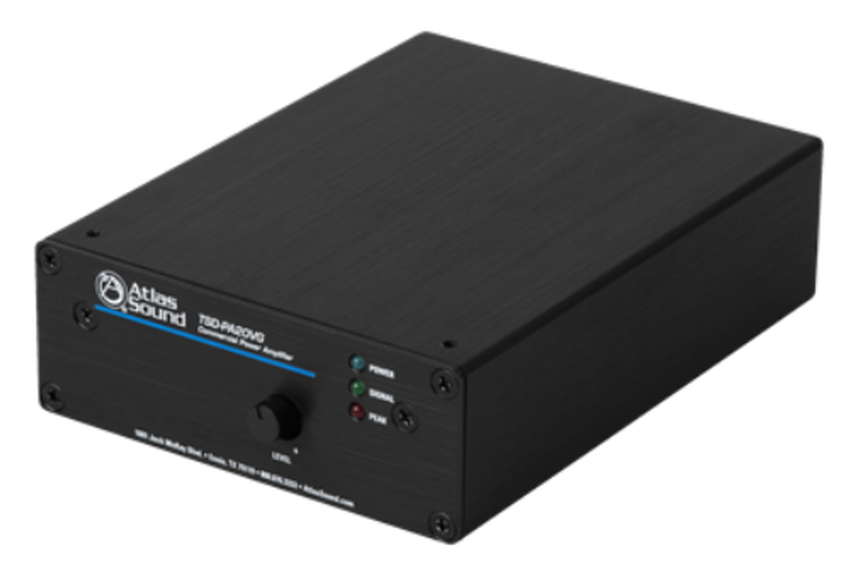 Atlas Sound's TSD-PA20VG is a mono amplifier for speaker systems up to 4Ohms. This device can be used with up to 16 25/70/100V ceiling speakers. The TSD-PA20VG is also ideal for sound-masking applications. It can drive up to 34 masking speakers tapped at .5W each on a 70.7-volt line.