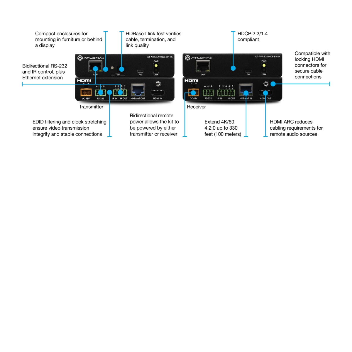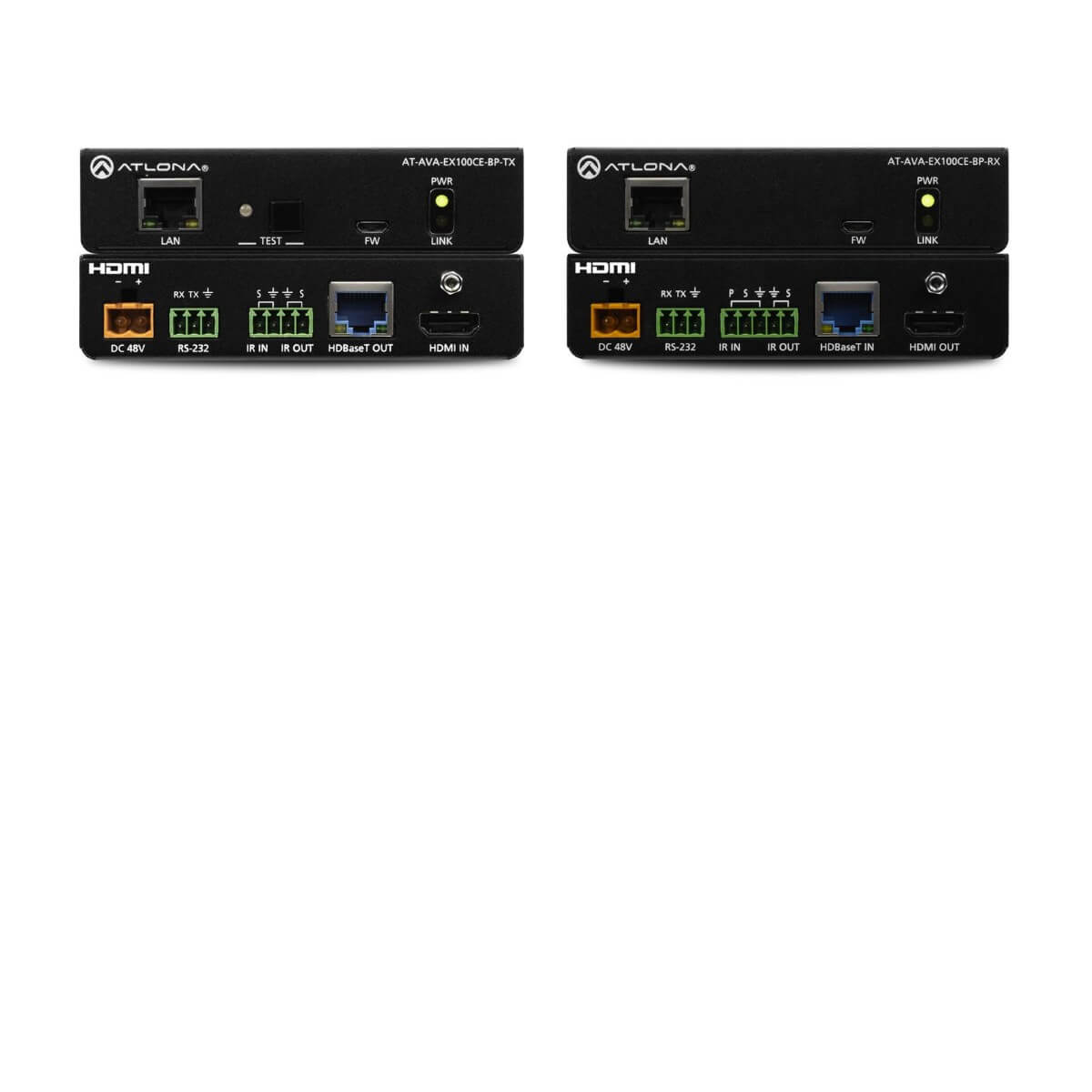The Atlona AT-AVA-EX100CE-BP-KIT is an Avance Series HDBaseT extender kit that supports Ethernet, control pass-through, and bidirectional remote power capabilities. The kit transmits 4K/UHD 60Hz 4:2:0 video up to 330 feet (100 meters). In addition to video with embedded multi-channel audio, 100Base-T Ethernet data, RS-232 and IR control signals, and remote powering by either the transmitter or the receiver are supported on the single Category 6A/7 cable. EDID filtering and clock stretching ensure video transmission integrity and stable connections. Integrated HDBaseT link test allows quick verification of cable, termination, and link quality. Audio Return Channel (ARC) is available on the HDMI connections to minimize cabling in audio return applications.