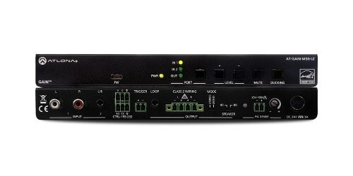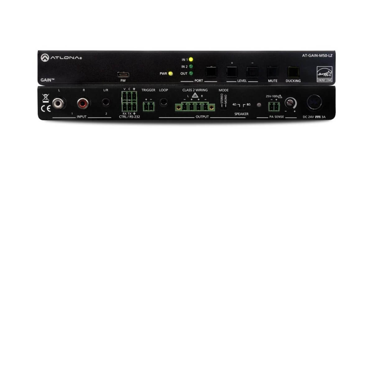 The Atlona AT-GAIN-M50-LZ is a two-input mixer amplifier designed for low impedance education and commercial applications. The amplifier delivers either two channels of 25 watts each into 4 or 8 ohms, or a single channel of 50 watts. The GAIN-M50-LZ features two unbalanced stereo audio inputs on RCA and 3.5 mm connections with independent level control for each. An unbalanced 3.5 mm output allows the mixed signal to be passed to an assistive listening system or separate amplifier.