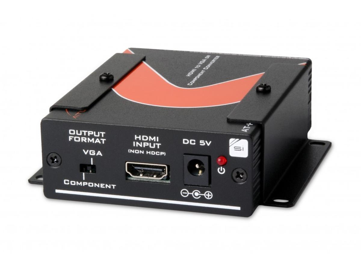 The Atlona AT-HD420 converts your HDMI to a VGA and stereo audio output. It will convert HDMI signals all the way up to 1080p to VGA and pass the audio to a 3.5mm stereo jack. The embedded EDID will simplify the installation procedure, the AT-HD420 will sync up with the source and let the source know to start outputting RGB or YPrPb format depending on the output selection and switch audio to stereo or PCM.