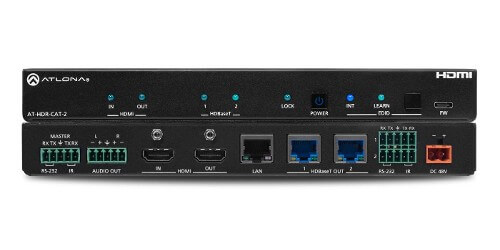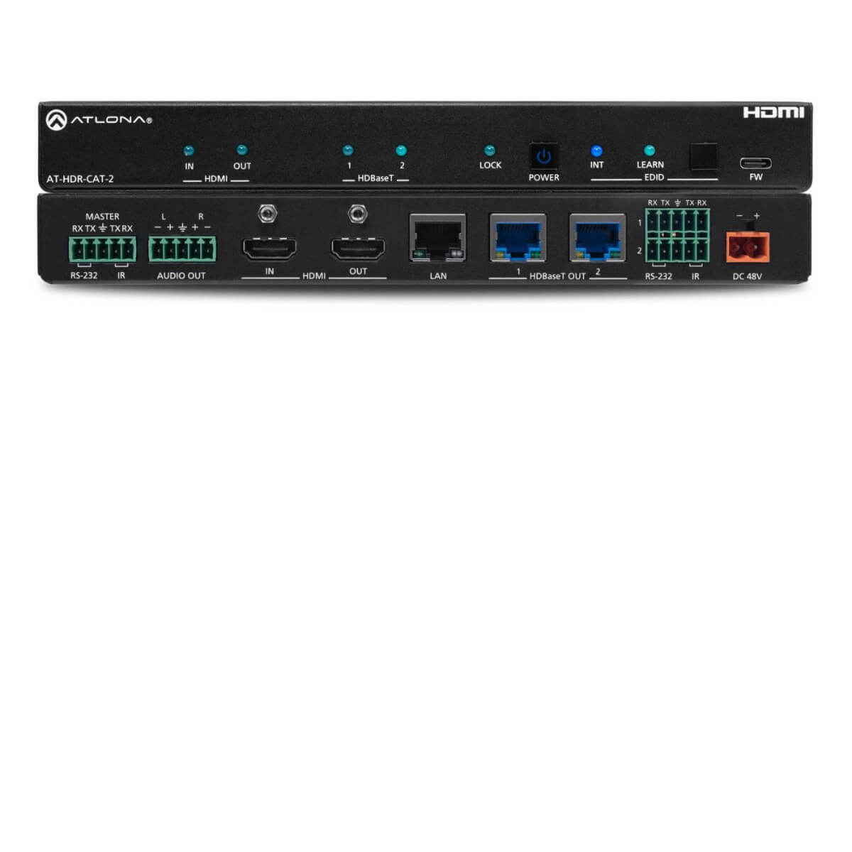 The Atlona AT-HDR-CAT-2 is a high dynamic range (HDR) distribution amplifier with one HDMI input and two HDBaseT outputs. Each output transmits 4K/UHD video @ 60 Hz with 4:4:4 chroma sampling plus support for HDR formats, multi-channel audio, control signals, and power up to 130 ft. (40 m) or 1080p up to 230 ft. (70 m) over Category 6/6A cable. The HDR-CAT-2 features sophisticated integration capabilities designed for commercial AV distribution applications including HDMI pass-through, audio de-embedding, EDID management, CEC display control, RS-232 and IR control extension, remote power for receivers, and HDBaseT link testing. It offers compatibility with any TCP/IP or RS-232 control system and is housed in a low-profile enclosure with external universal power supply. The HDR-CAT-2 is ideal for sending HDR and 4K/60 4:4:4 content to AT-HDR-EX-70C-RX receivers.