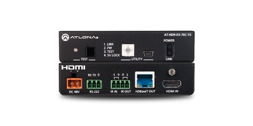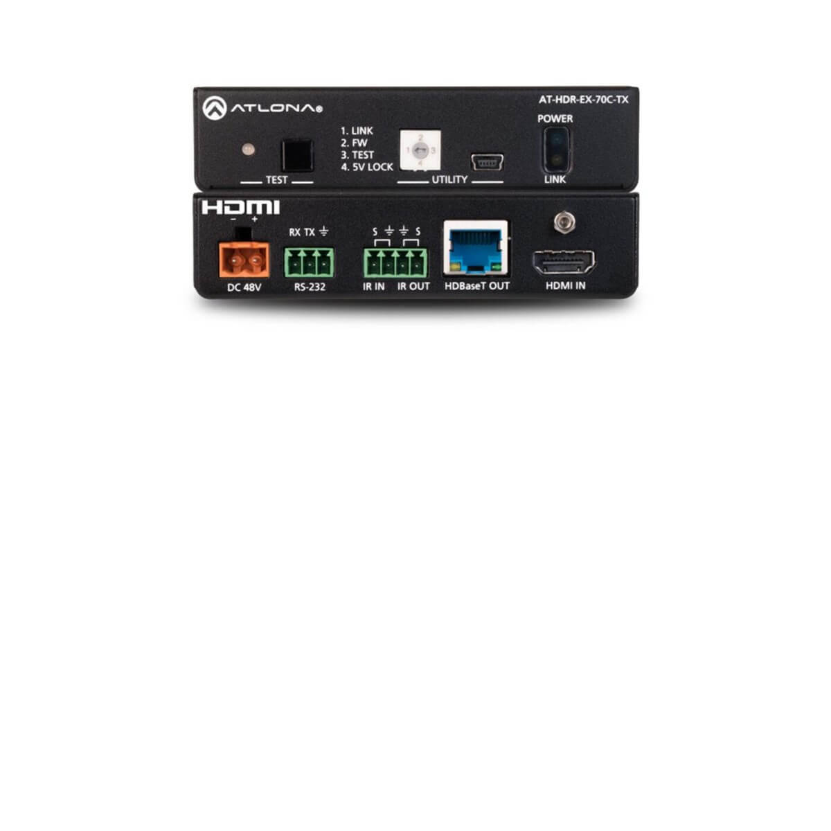 The Atlona AT-HDR-EX-70C-TX is a HDBaseT transmitter for 4K and high dynamic range (HDR) content. It supports extension of 4K/UHD video @ 60 Hz with 4:4:4 chroma sampling plus HDR data, multi-channel audio, control signals, and power up to 130 ft (40 m) or 1080p up to 230 ft (70 m) over Category 6/6A cable. The HDR-EX-70C-TX is ideal for use with the AT-HDR-EX-70C-RX receiver for transmitting 4K HDR in point-to-point applications. It can also be used with the AT-UHD-CLSO-824 and AT-UHD-SW-5000ED for transmitting 4K/UHD @ 60 Hz 4:2:0 signals to the switchers from a remote source. Housed in a compact enclosure, it can be conveniently mounted in furniture, a lectern, or an equipment rack.