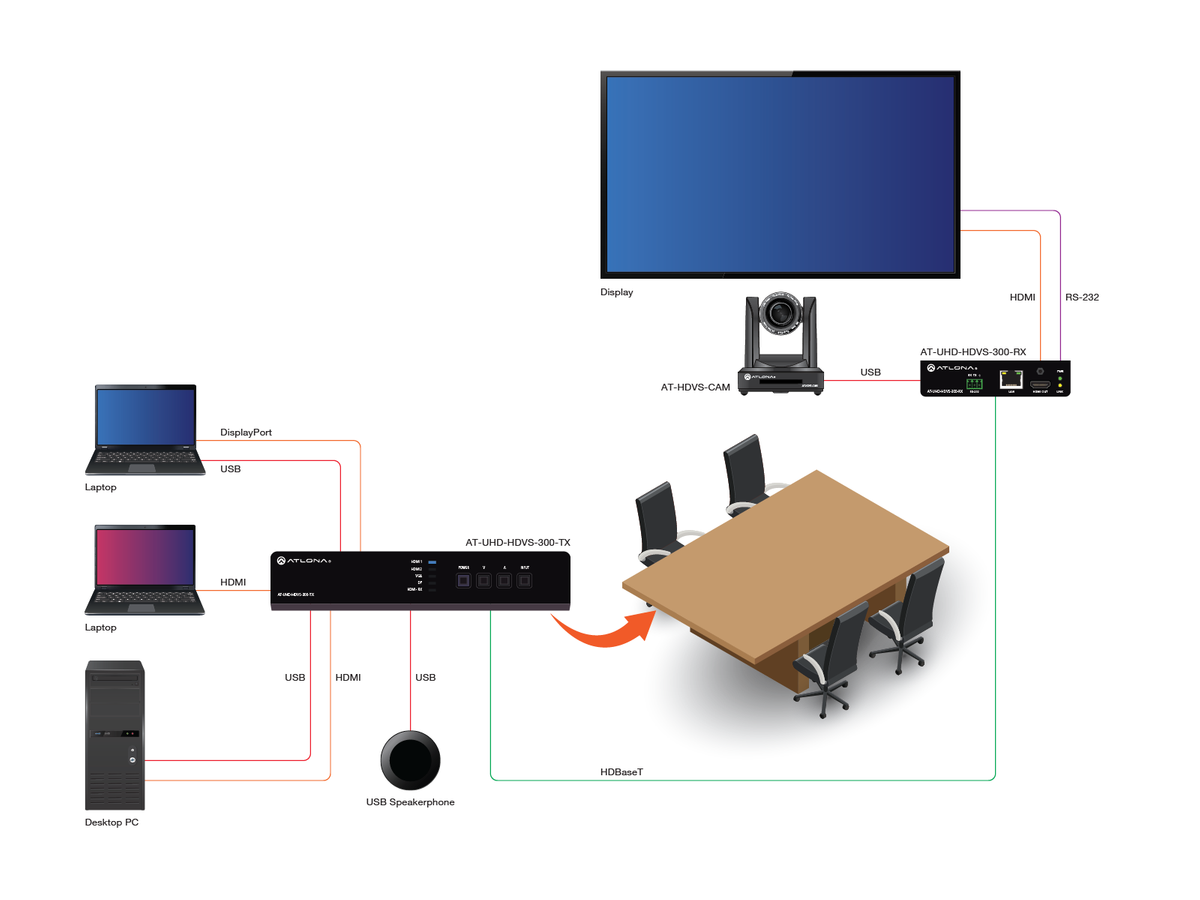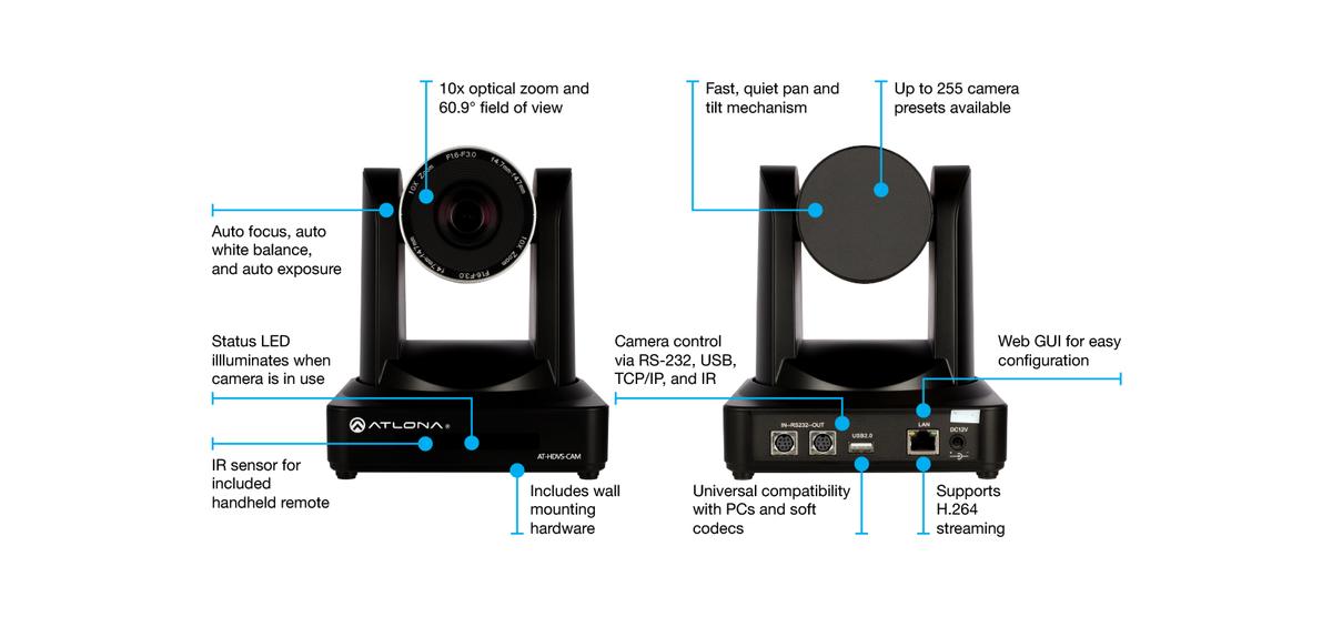 Introducing the AT-HDVS-CAM PTZ Camera for HDVS-300 Soft Codec Conferencing System from Atlona. This camera is designed for use in soft codec conferencing applications with the AT-UHD-HDVS-300-KIT. It seamlessly integrates with the above listed kit for a complete, automated conferencing system that includes AV as well as USB extension. The USB interface features video and camera control, with automatic input selection and, when a PC is connected, display powering.
