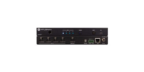 Other primary features built-in to the AT-JUNO-451 includes EDID management features and automatic input switching. It also supports the HDMI Audio Return Channel (ARC) for receiving digital audio from a television. A TOSLINK digital audio output is provided for sending ARC or de-embedded HDMI audio to an AV receiver or soundbar (not included). This JunoX Series HDMI switcher can be controlled via Ethernet, RS-232, and IR. A handheld IR remote control is included. This unit supports the following Multi-channel audio formats: PCM, Dolby Digital, Dolby Digital Plus, Dolby TrueHD, Dolby Atmos, DTS Digital Surround, and DTS-HD Master Audio. In addition it allows any multi-channel audio stream to be used within a residential or professional audio system.