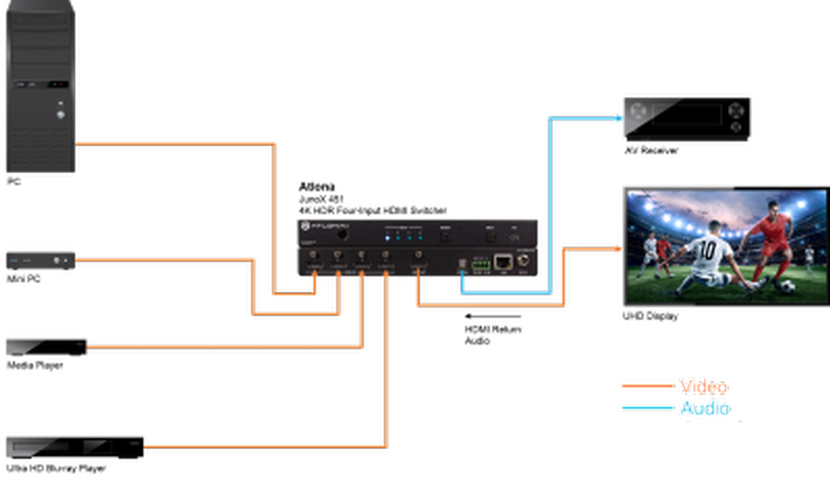 Designed for an array of installation type applications utilizing the latest UHD and HDR sources, such as Ultra HD Blue-ray players, flat panel displays, to high-end content distribution and professional AV applications with full-motion, highly detail 4K graphics presentations. The Atlona AT-JUNO-451, is a high quality 4x1 Auto Switcher that comes with amazing features, and at an amazing price. It is backed by a 10 year warranty from Atlona.