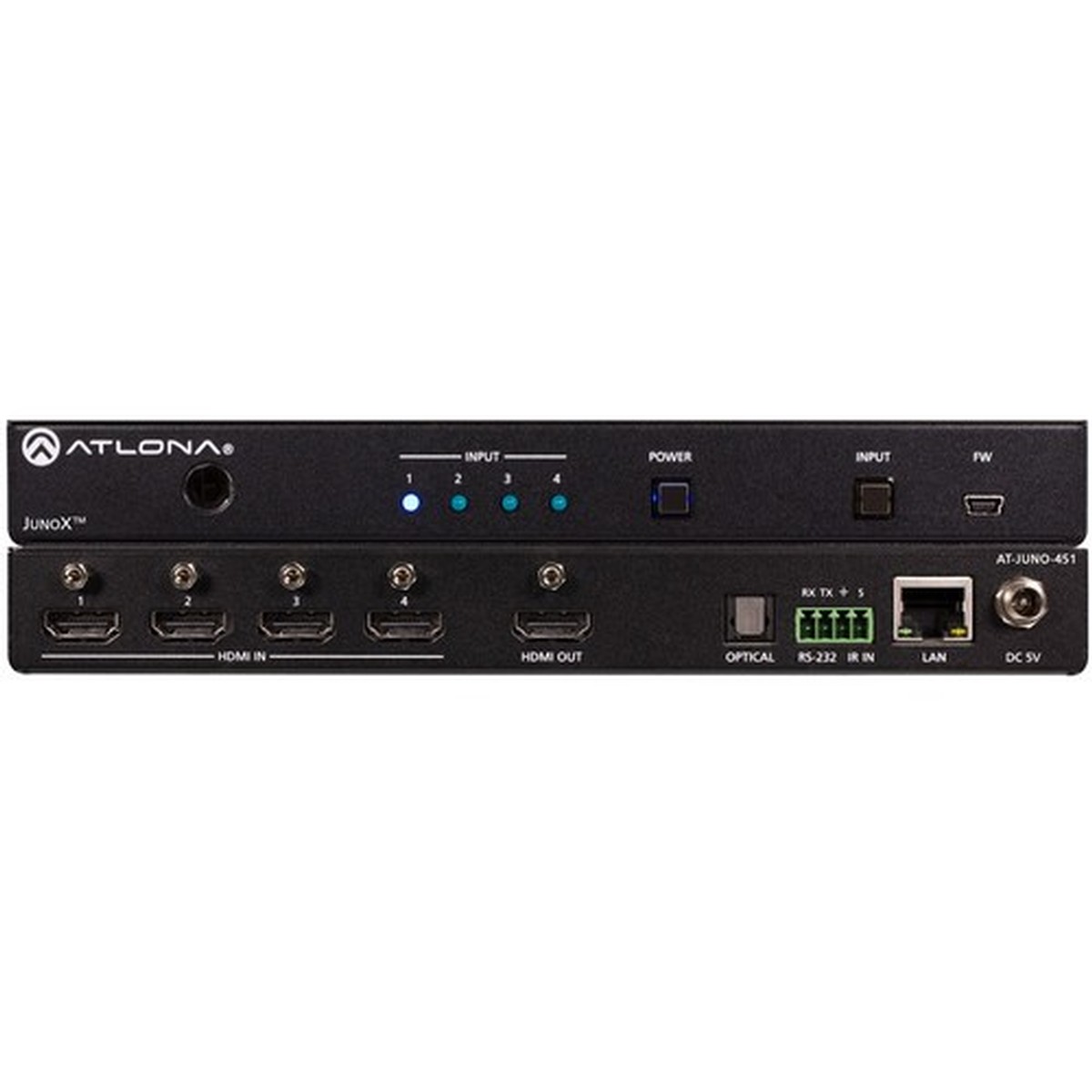 The Atlona JunoX 451 (AT-JUNO-451) is a high-performance 4x1 HDMI switcher designed for high dynamic range (HDR) formats. It is HDCP 2.2 compliant and will support the highest 4K/UHD resolutions (4K/60 4:4:4), with HDMI data rates up to 18 Gbps. Being designed for residential applications to keep pace with the latest 4K/UHD and HDR sources used in high-quality home theater systems, this device is compatible with all video resolutions, audio formats, and color space formats that are supported in the HDMI 2.0a specifications, plus it has the ability to pass metadata for HDR content. Designed for reliable Auto-Switching the AT-JUNO-451 will automatically select an input source based on detection of the 5 volt hot plug detect (HDP) signal, as well as active video. This ensures reliable auto-switching operation without interruption with all video sources, including DVR's, DisplayPort / Mini DisplayPort adapters, and other devices that always maintain the HDP line at the 5 volt "high" state but may not be delivering active video.