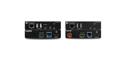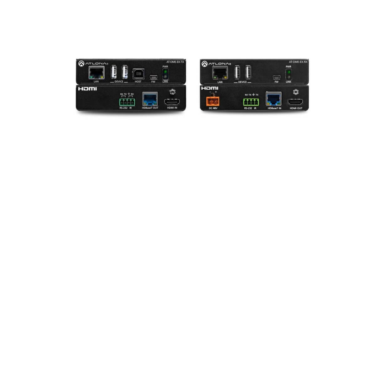 The Atlona AT-OME-EX-KIT is an HDBaseT extender for video up to 4K/60 4:2:0, plus embedded audio, control, Ethernet, and USB over distances up to 330 feet (100 meters). Part of the Omega Series of integration products for modern AV communications and collaboration, the OME-EX-KIT is HDCP 2.2 compliant and extends IR, RS-232, and IP control signals. The integrated USB extension addresses the challenge of connecting between USB devices at remote locations, and is ideal for software video conferencing and touch or interactive displays. The OME-EX-TX transmitter includes a USB 2.0 host interface for a PC, plus two peripheral devices such as a speakerphone, microphone, or keyboard and mouse. The OME-EX-RX receiver provides two USB interfaces for devices such as a camera, soundbar, or display. The transmitter and receiver are available separately, for use with other Omega Series integration products.