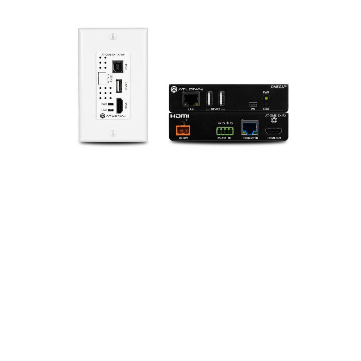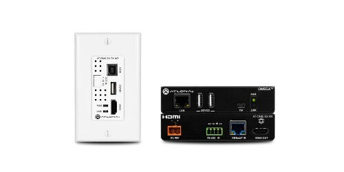 The Atlona AT-OME-EX-WP-KIT is an HDBaseT extender for video up to 4K/60 4:2:0, plus embedded audio, control, and USB over distances up to 330 feet (100 meters). The transmitter features a US one-gang, wallplate form factor, and includes interchangeable black and white wallplates and faceplates. Part of the Omega Series of integration products for modern AV communications and collaboration, the OME-EX-WP-KIT is HDCP 2.2 compliant and extends RS-232 control signals. The integrated USB extension addresses the challenge of connecting between USB devices at remote locations, and is ideal for software video conferencing and touch or interactive displays. The OME-EX-TX-WP transmitter includes a USB 2.0 host interface for a PC, plus a peripheral device such as a speakerphone, microphone, or keyboard and mouse. The OME-EX-RX receiver provides two USB interfaces for devices such as a camera, soundbar, or display. The transmitter and receiver are available separately, for use with other Omega Series integration products.