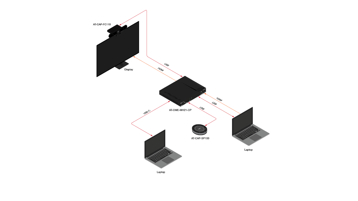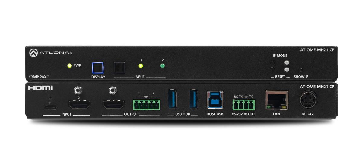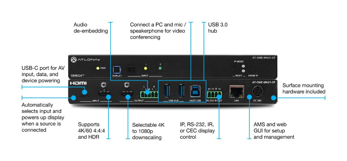 The Atlona AT-OME-MH21-CP is a compact, versatile switcher with HDMI and USB-C inputs. It is equipped with features for complete AV integration in huddle rooms and small meeting spaces, including automatic switching and display control, audio de-embedding, and a USB 3.0 hub for video conferencing peripherals or touch displays. Part of the Omega™ Series of integration products for modern AV communications and collaboration, the OME-MH21-CP is HDCP 2.2 compliant and supports 4K HDR and 4K/60 4:4:4 at HDMI data rates up to 18 Gbps. Additionally, 4K downscaling to 1080p @ 60, 30, or 24 Hz is available when connected to an HD display. The OME-MH21-CP includes USB 3.0 and USB-C interfaces for two host PCs, plus two peripheral devices such as a camera, microphone, speakerphone, touch-enabled display, or keyboard and mouse. The USB-C port provides up to 60 watts of device charging capability for laptops and mobile devices.