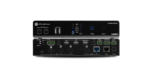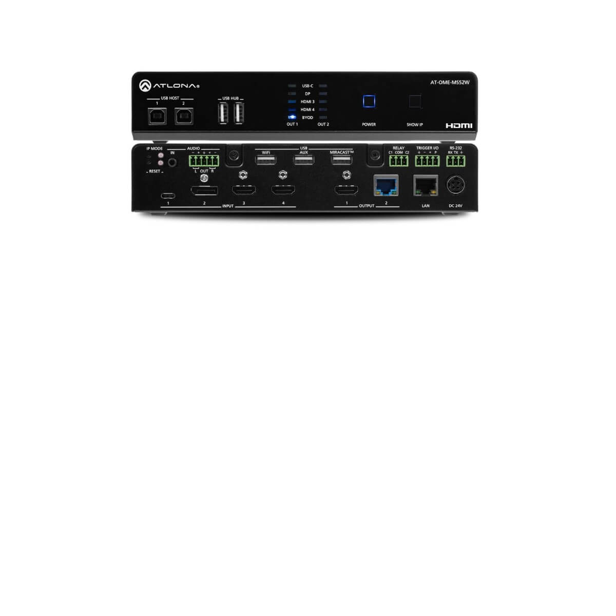The Atlona AT-OME-MS52W is a 5×2 matrix switcher with HDMI, USB-C®, DisplayPort, and wireless AV inputs, plus HDMI and HDBaseT outputs. It features wireless presentation capability and native screen mirroring for iOS®, Android™, Mac®, Chromebook™, and Windows®. Part of the Omega™ Series of integration products for modern AV communications and collaboration, the OME-MS52W is HDCP 2.2 compliant and features HDBaseT extension for video up to 4K/60 4:2:0, plus embedded audio, control, Ethernet, and USB over distances up to 330 feet (100 meters). All inputs and the local HDMI output support 4K HDR and 4K/60 4:4:4 at HDMI data rates up to 18 Gbps. The integrated USB extension addresses the challenge of connecting between USB devices at remote locations, and is ideal for software video conferencing and touch or interactive displays. The OME-MS52W includes USB 2.0 and USB-C interfaces for three host PCs, plus two peripheral devices such as a camera, microphone, speakerphone, or keyboard and mouse.