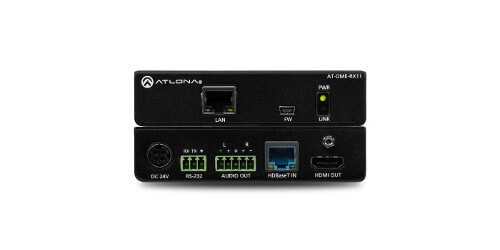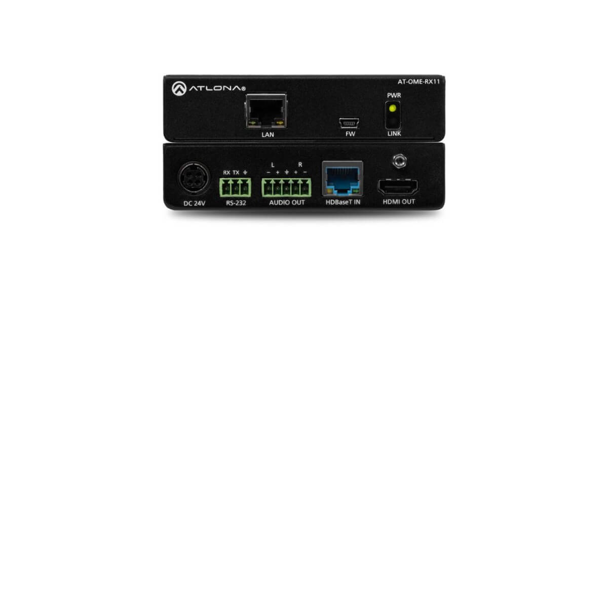 The Atlona AT-OME-RX11 is an HDBaseT receiver for video up to 4K/60 4:2:0, plus embedded audio, control, and Ethernet over distances up to 330 feet (100 meters). Part of the Omega Series of integration products for modern AV communications and collaboration, the OME-RX11 is HDCP 2.2 compliant and receives RS-232 and IP control signals. Additionally, this receiver features two-channel audio de-embedding to a balanced analog audio output. The OME-RX11 is locally powered, and can deliver remote powering over HDBaseT to an Atlona Omega Series, HDVS-200 Series, or AT-UHD-EX-100CE-TX-PD transmitter.