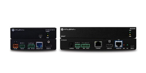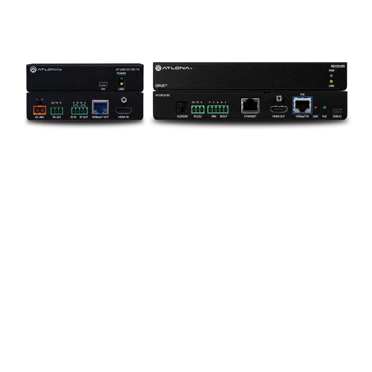 The Atlona AT-OPUS-70C-KIT is an HDBaseT transmitter/receiver kit for transmission of AV signals up to 230 feet (70 meters) over category cable with RS-232 and IR control plus Power over Ethernet capability. The kit transmits video signals up to 4K/UHD @ 60Hz with embedded multi-channel audio and remote 48V power for the receiver. HDCP 2.2 compliance ensures compatibility with the latest copy protection requirements and EDID communication is supported. Included brackets allow the devices to be surface mounted on furniture or behind a display. For higher density applications, the transmitterÂ’s compact enclosure allows four to be mounted in a single 1U rack tray, and they support power chaining for powering multiple units from one power supply. The AT-OPUS-70C-KIT is ideal for use in residential or commercial point to point applications that require HDBaseT signal transmission over greater distances than standard cables can support.