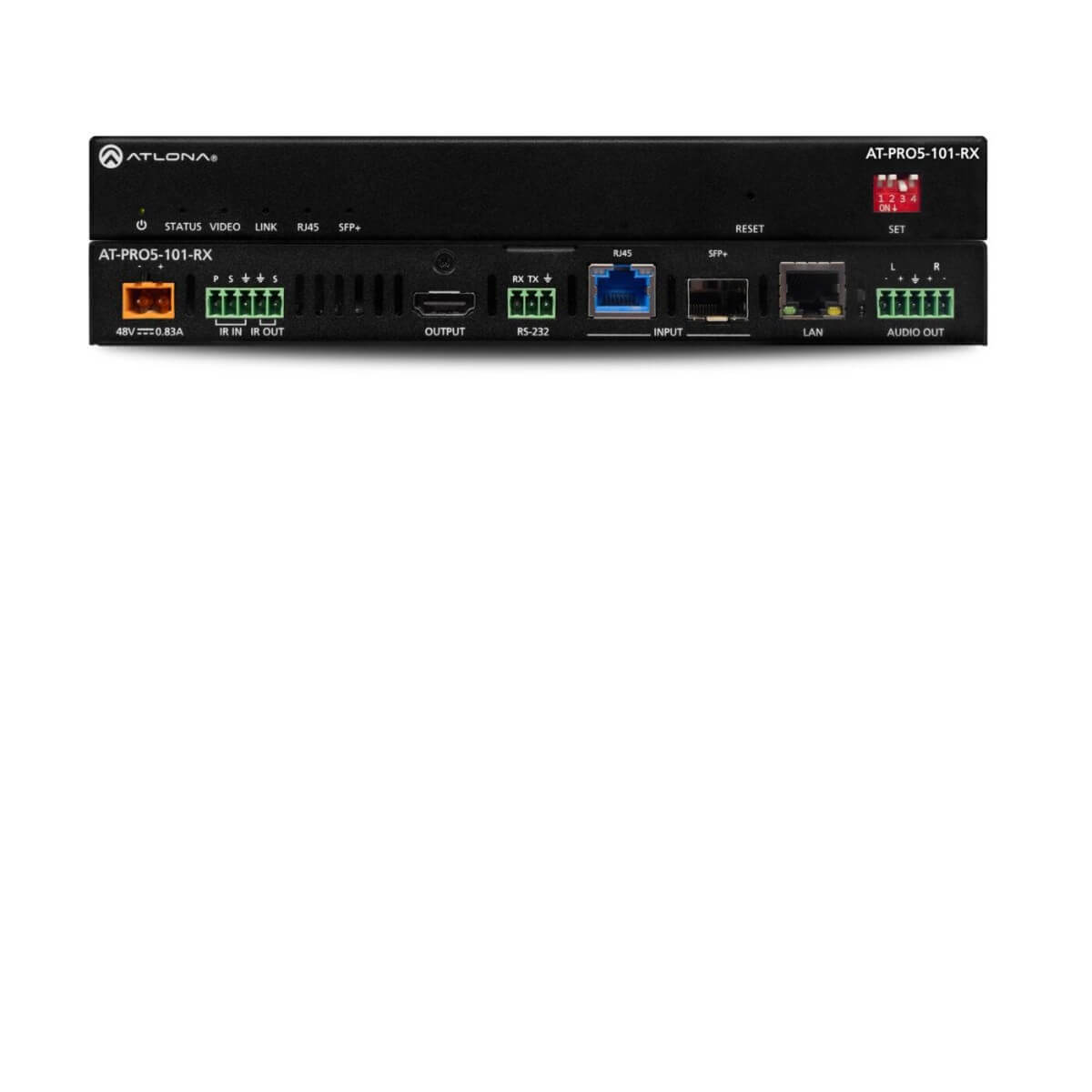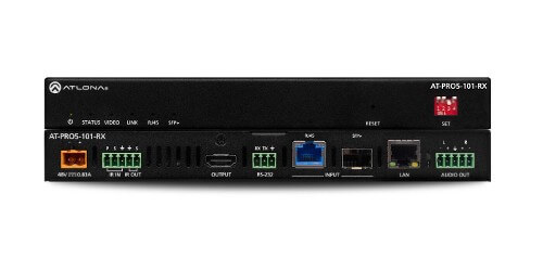 The Atlona AT-PRO5-101-RX is an AV extension receiver, featuring SDVoE 10GbE connectivity for receiving ultra-high definition video and audio from the AT-PRO5-MX810 matrix switcher. Part of the PRO5 Series, the PRO5-101-RX is HDCP 2.3 compliant, and supports 4K/60 4:4:4 and HDR at HDMI data rates up to 18 Gbps. It features an RJ45 port, and an SFP+ cage for copper or fiber optic connectivity to receive video, embedded audio, Gigabit Ethernet, and RS-232 and IR control signals from the matrix switcher. The RJ45 port allows extension up to 330 feet (100 meters) over CAT6a UTP cable, along with PoE for powering the PRO5-101-RX, while the SFP+ cage can be used with a compatible fiber optic module to extend from 38 meters up to 10 kilometers over fiber optic cable. The PRO5-101-RX SDVoE receiver, together with the PRO5-MX810 HDMI to SDVoE matrix switcher, is ideal for a wide range of commercial applications requiring multi-zone AV distribution with long-distance signal extension.