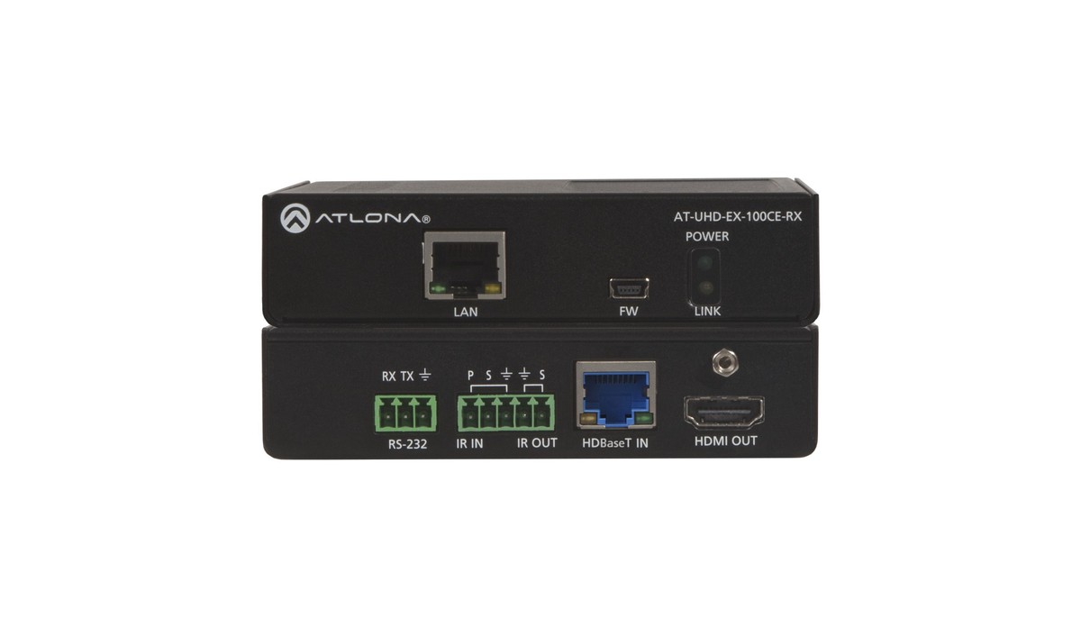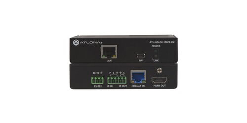The Atlona AT-UHD-EX-100CE-RX is an HDBaseT receiver for your HDMI signal, it is the long range version so it can transmit up to 328'. Not only can you receive resolutions up to 4K, but you can also receive your power, IR, and RS-232 over the same Ethernet cable. The AT-UHD-EX-100CE-RX also supports EDID and is HDCP 2.2 compliant.