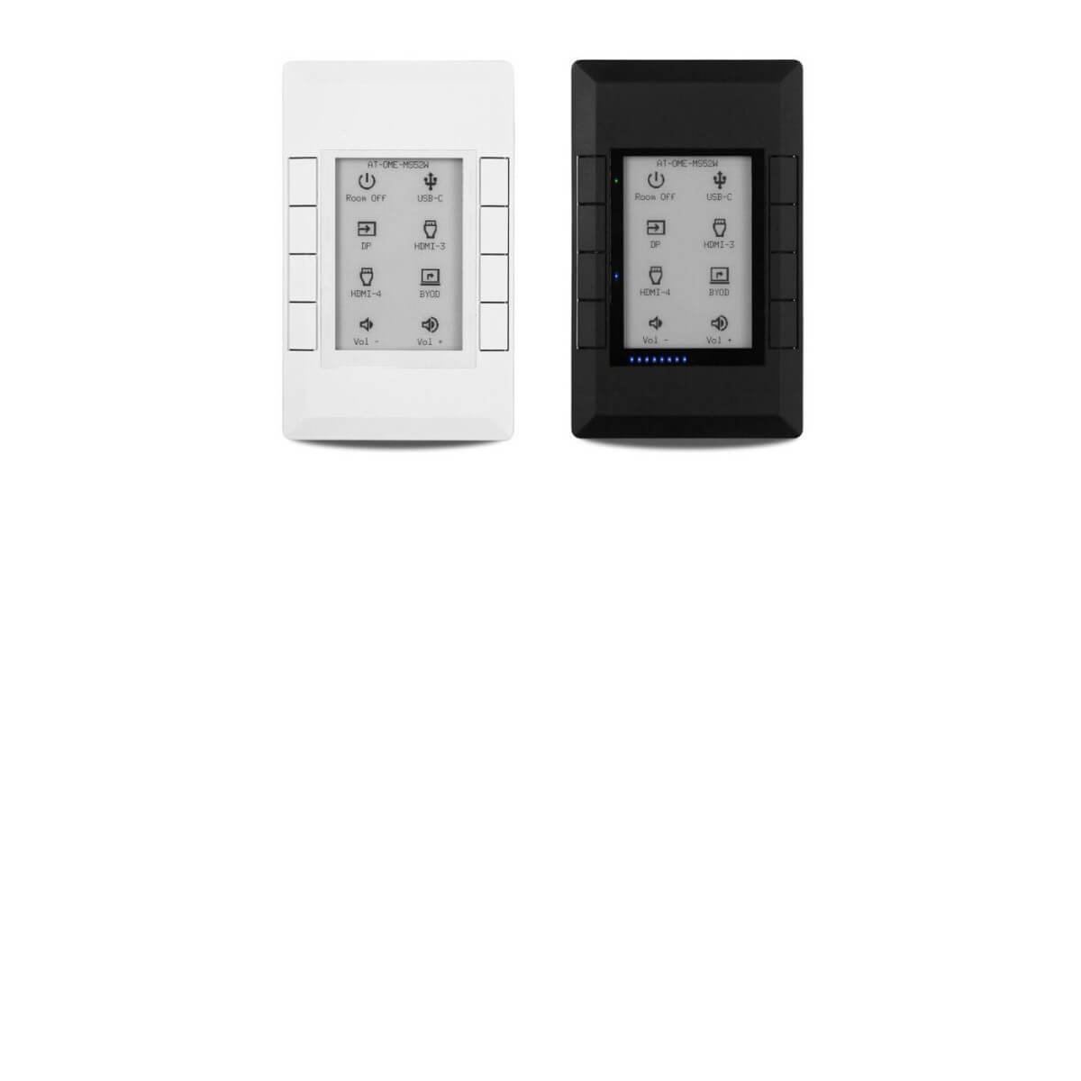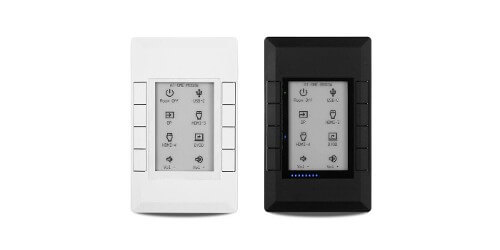 The Atlona AT-VKP-8E is a simple yet powerful 8 button IP-based keypad controller for one room of up to 10 devices. The buttons are fully configurable for controls such as display power, input switching, audio levels, or any other functions supported by system devices. In addition to Ethernet, the VKP-8E also features RS-232 for control of legacy devices. For enhanced customization, the VKP-8E incorporates a 2.7" electronic paper (e-paper) display that supports multiple pages to dynamically change icons and text associated with the buttons. LED indicators for each button and a multi-step LED level indicator provide additional feedback to users. The VKP-8E is designed to mount in one-gang US junction boxes and comes with both black and white faceplates that attach to the button panel via magnets. Power over Ethernet (PoE) provides both power and data to the panel over a single cable. For setup, the VKP-8E uses a revolutionary new configuration platform called Atlona Cloud. It provides an intuitive interface for mapping control commands, text, and icons to buttons using the extensive library of Atlona and third-party device drivers. When configuration is complete, lightweight instructions can either be sent to the VKP-8E directly over the network or stored in a file for later upload.