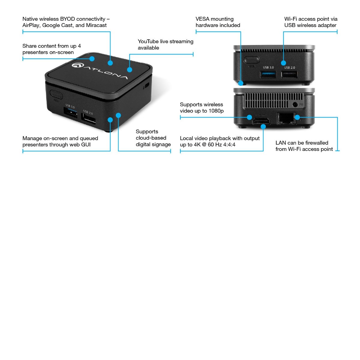 The Atlona AT-WAVE-101 is a wireless presentation and collaboration platform designed for easy content sharing with iOS, Android, Mac, Chromebook, and Windows® devices. The WAVE-101 allows up to four presenters to share their content simultaneously on-screen, with an Instructor Mode available for managing additional presenters and selecting which to be displayed. Wireless BYOD interfacing is simply enabled through the device’s native casting protocol (such as AirPlay, Google Cast, or Miracast), without the need to install an app. For hands-free, effortless user operation, Dynamic Layout Mode is an innovative feature of the WAVE-101 that automatically adapts the on-screen layout to new incoming or disconnected source content. The WAVE-101 is equipped with a host of other convenient features for integrators and end users, including programmable display control, display of user-uploaded images and video media, YouTube™ Live streaming, support for cloud-based digital signage applications, and much more.