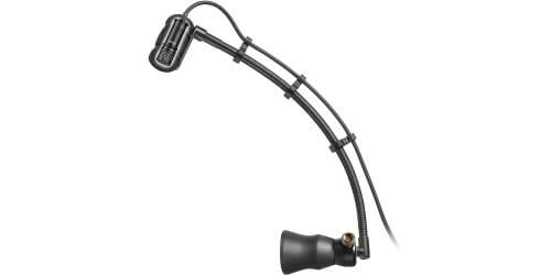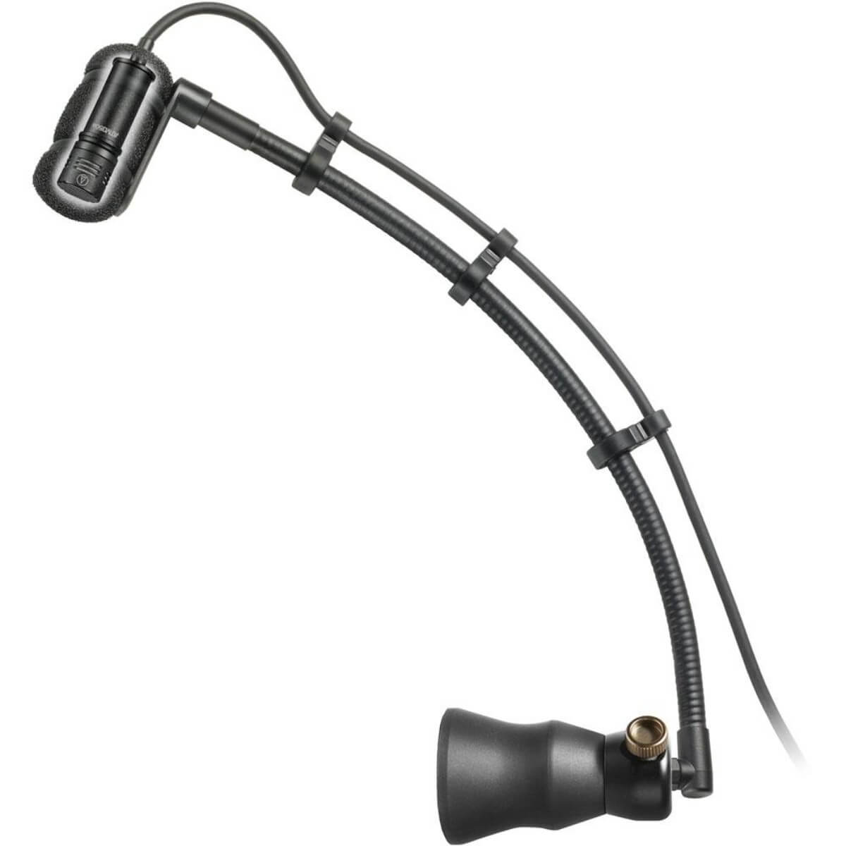Cardioid condenser instrument microphone with universal clip-on mounting system,