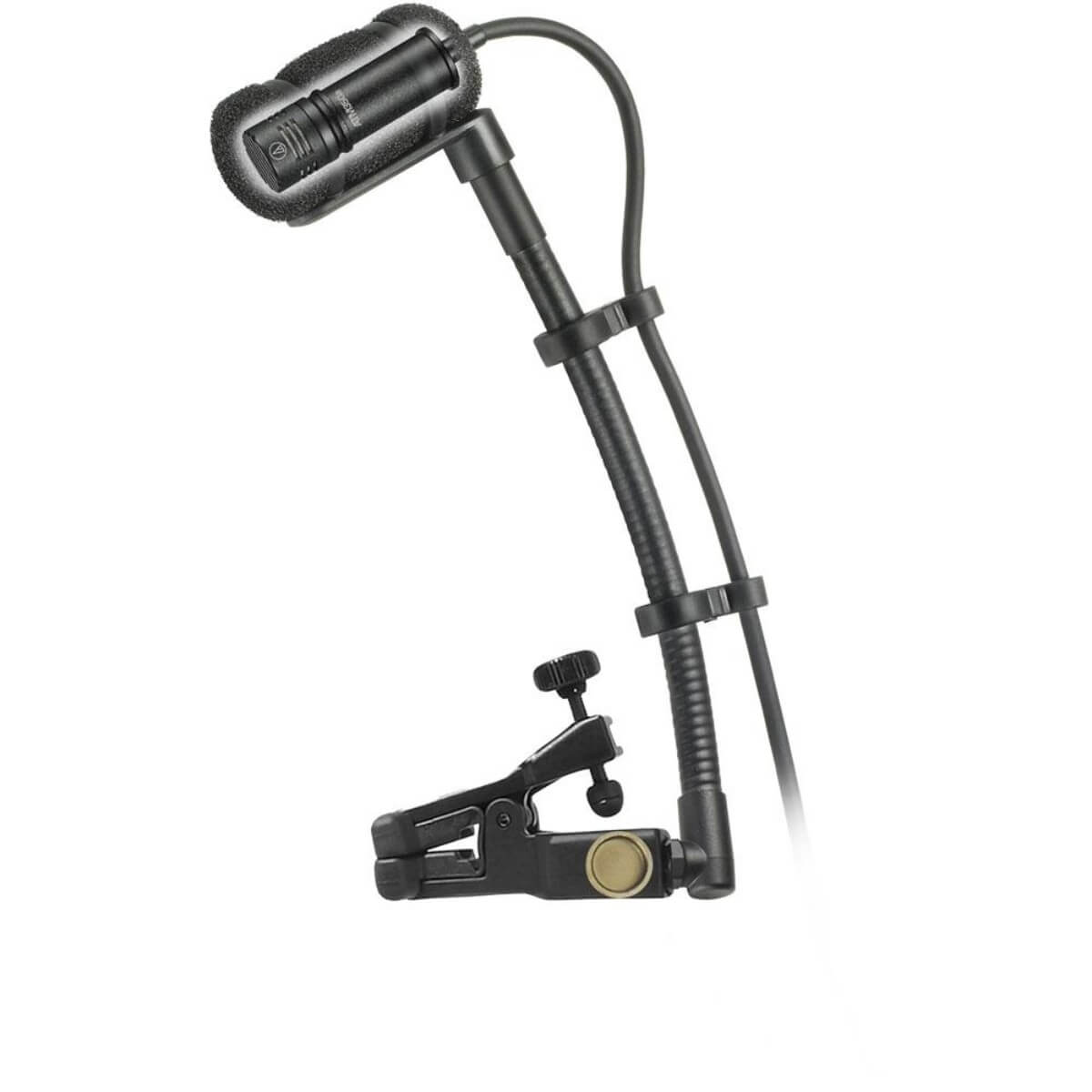 Cardioid condenser instrument microphone with universal clip-on mounting system,