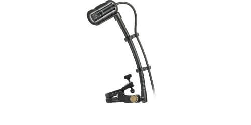 Cardioid condenser instrument microphone with universal clip-on mounting system,