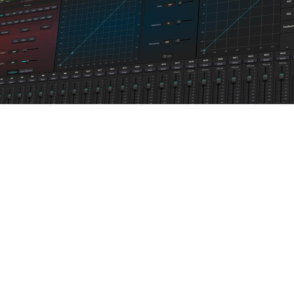 - AFC (Automatic feedback suppression), AEC (Acoustic echo cancellation), ANS (Automatic noise suppression), ANC (Automatic noise gain compensation), AGC (Automatic gain control), gain sharing, threshold auto mix, ducking processing module