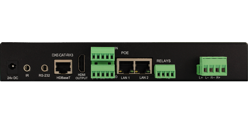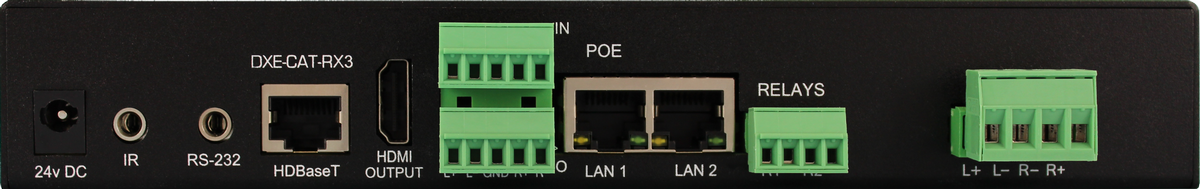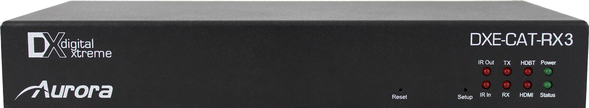 The Aurora DXE-CAT-RX3 is an HDBaseT receiver that can accept your video connection as well as power, Ethernet, bi-directional RS-232, and IR up to 600'. The receiver is HDCP compliant, supports 3d, resolutions up to 1080P, and includes a mount for wall or rack mounting. A unique feature of this model is that it has a PoE port so power can be injected from a PoE switch which will also provide power to the transmitter. All the connections are on one side with LED lights on the front, the DXE-CAT-RX3 is easy to install.