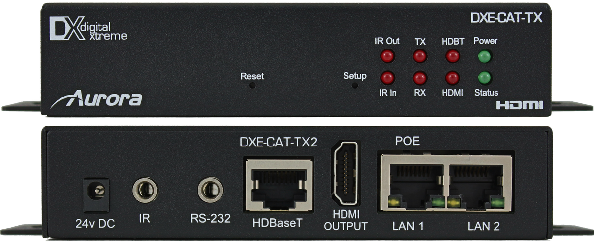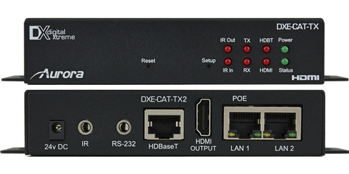 The Aurora DXE-CAT-TX2-4K is an HDBaseT transmitter that can send your video connection as well as power, Ethernet, bi-directional RS-232, and IR up to 600'. The transmitter is HDCP compliant, supports 3d, resolutions up to 4K30, and includes a mount for wall or rack mounting. A unique feature of this model is that it has a PoE port so power can be injected from a PoE switch, this will send power to both the receiver and transmitter. All the connections are on one side with LED lights on the front, the DXE-CAT-TX2-4K is easy to install.