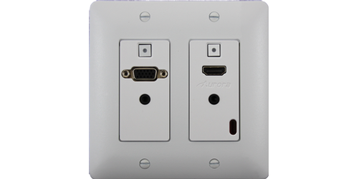 DXW-2: Wall plate that houses 1 VGA, 1 HDMI, and 2 audio. It takes all these signals as well as embedded audio and can transmit them up to 600' over HDBaseT via an Ethernet cable to a compatible receiver, not only does it send the signal but it even converts and scales the signal. The wall plate is even an auto switcher, it will always detect the last plugged in input and automatically switch on your display.