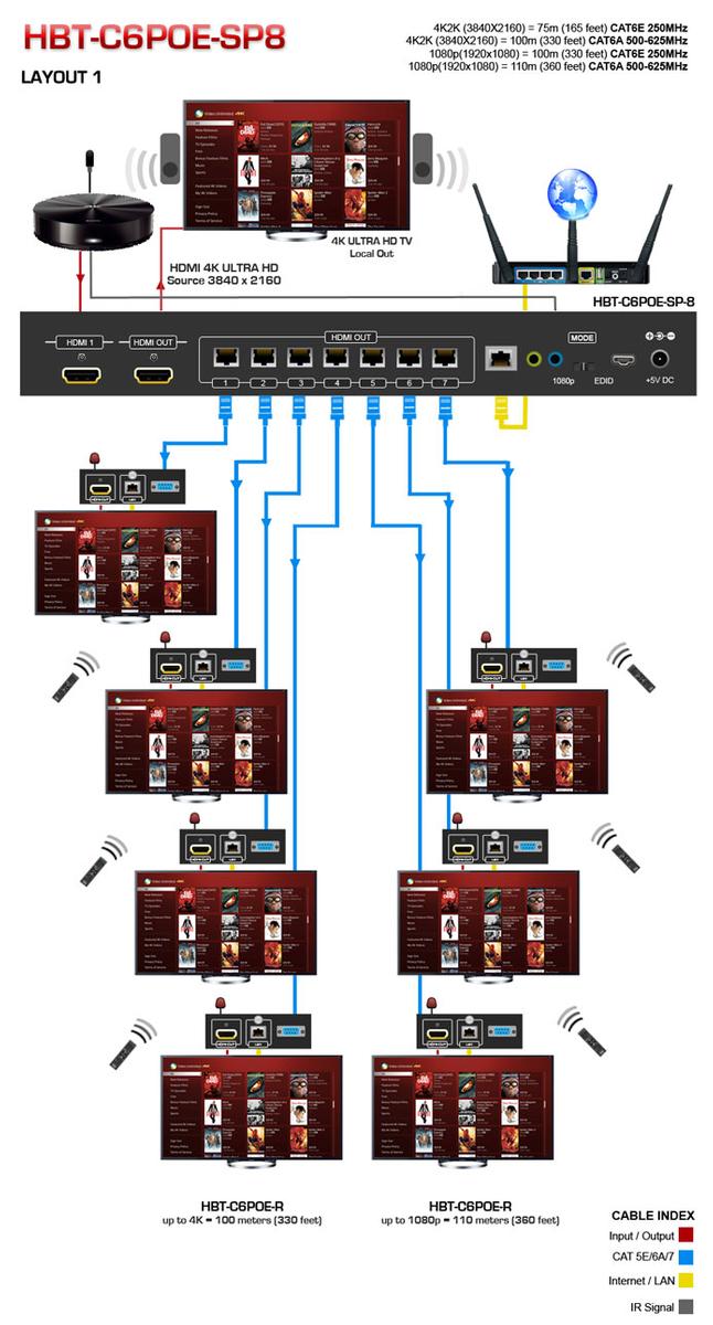 - HDMI Range: 4K UHD up to 330' using CAT6e/6a/7 cables