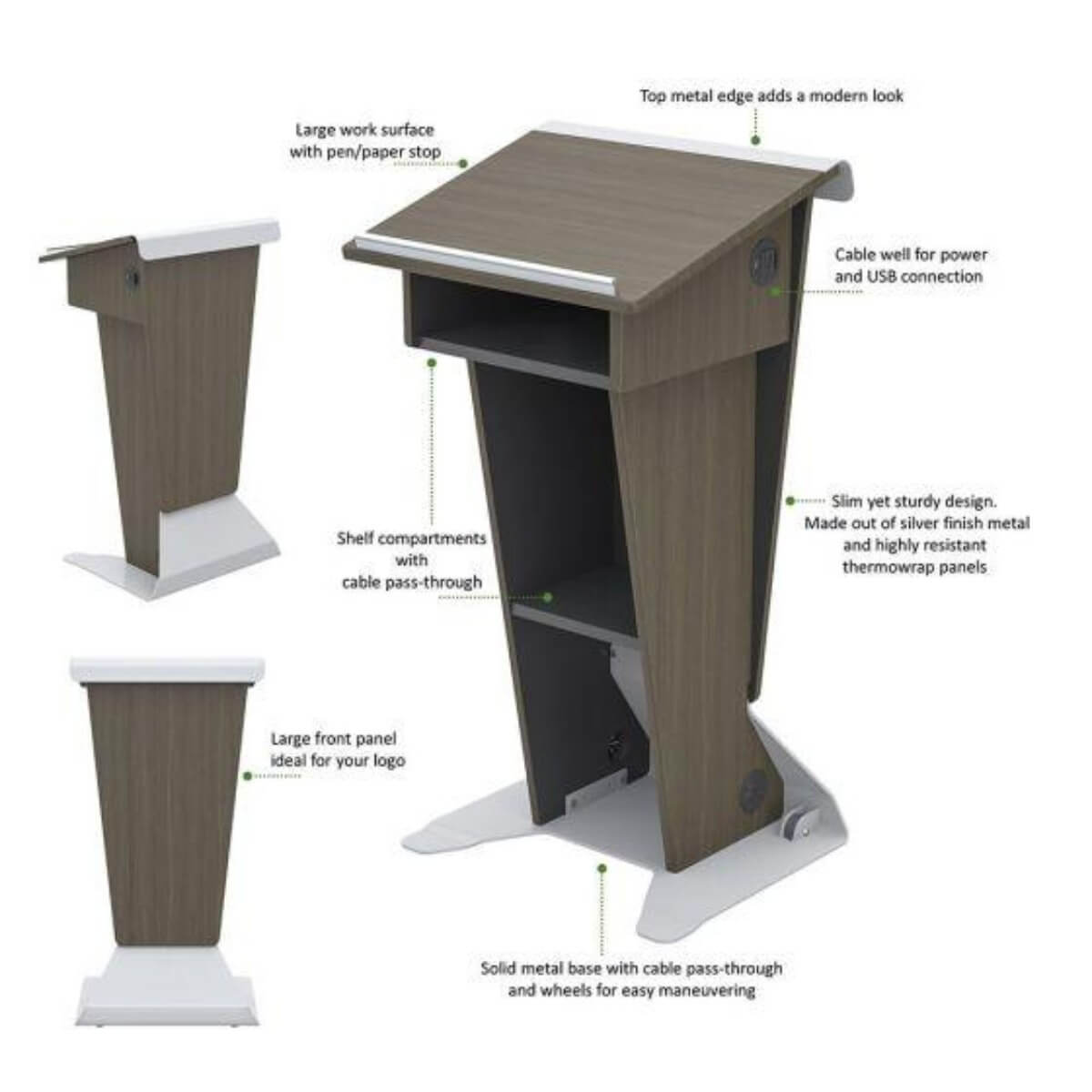 The LE222 is a modern style lectern with a singular slim yet sturdy design, made out of silver finish metal and highly resistant thermowrap panels. This lectern is mobile and offers a large reading surface with pen/paper stop, shelf compartments and a cable well on the right side for power and USB connection.