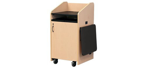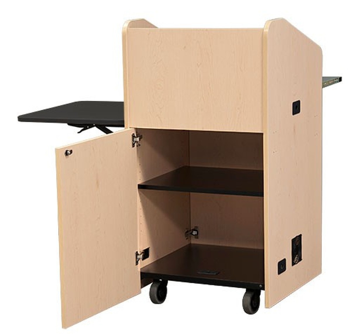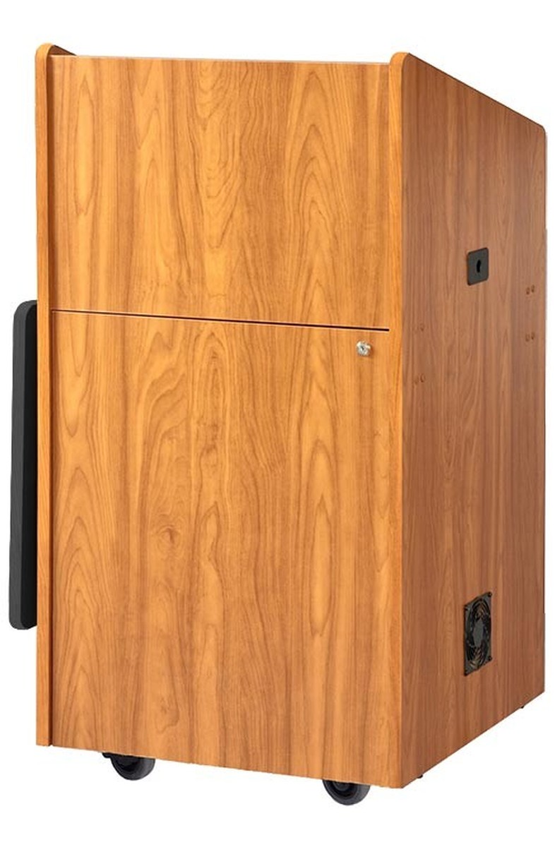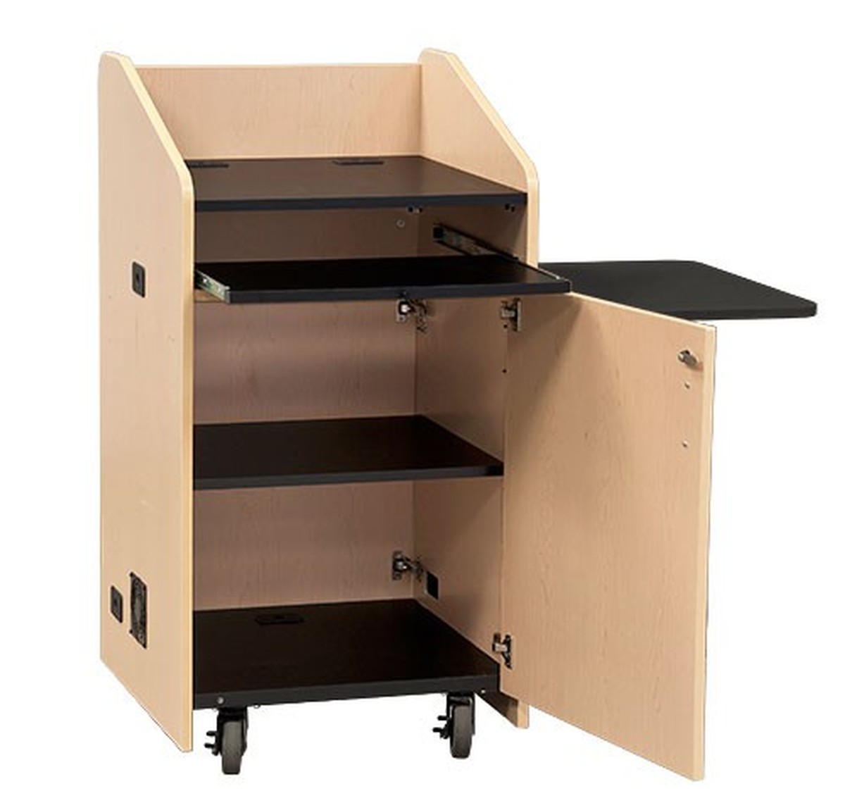 The AVF LE3040 is a lectern on heavy duty casters that allows it to be mobile, it features a flip up shelf, slide out keyboard tray, and interior adjustable removable shelf. Also included is a locking door to keep all your equipment hidden and provide a nice clean look. The LE3040 comes in 10 different high quality furniture grade 3 millimeter thick laminate colors to meet the desired look in your room, choose from maple, bartlett pearwood, Brazilian walnut, soprano, aria, baroque, cherry hill plank, white, storm, and black.