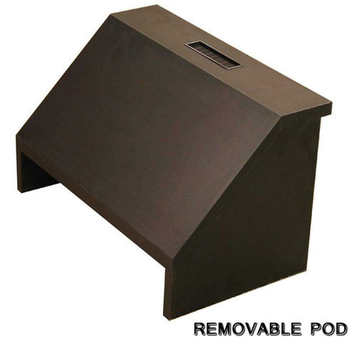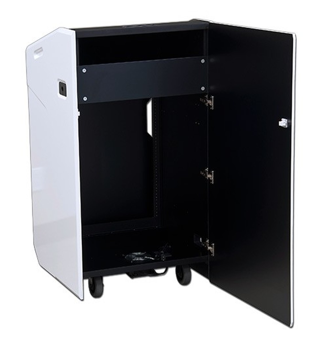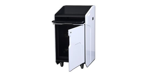 The side of the podium that the audience sees has no visable hardware, a special magnetic latch opens the door by using an included magnet. The door allows you to be able to easily gain access and wire up your equipment on the back of the rack. The top of the podium has a removable pod, you can use this space for a monitor by removing the pod or you can install equipment in this pod.