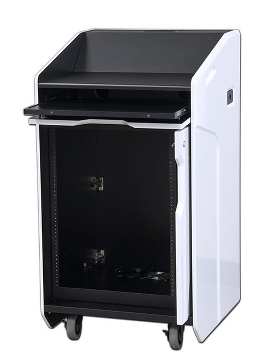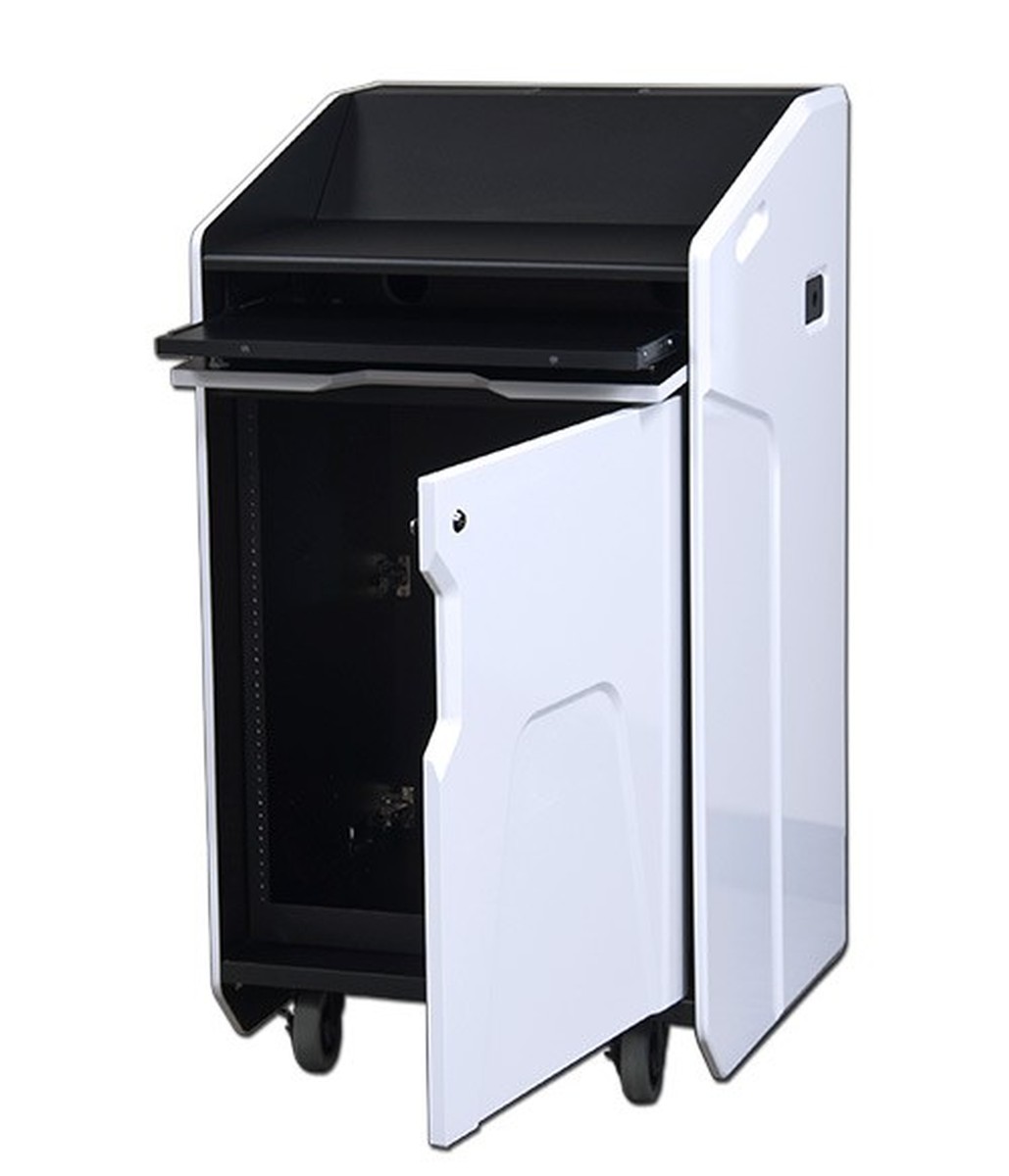 Mobile High Tech Podium: Rack Mount, Keyboard Tray Shelf, 12 Colors