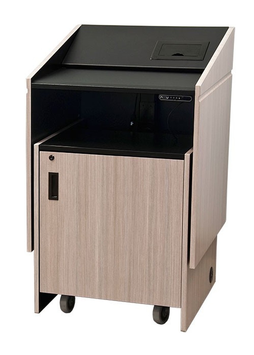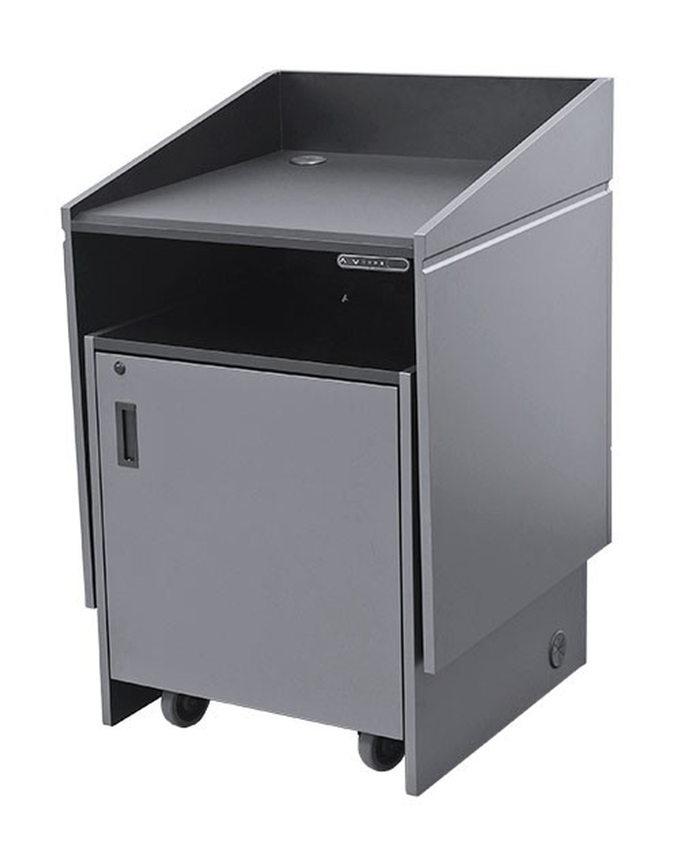 The AVF LEXYZ34 is an electric lift podium that allows it be be adjusted to the correct height of the presenter with just a push of the button. The top height can be adjusted from 33" to 45" in any increment and quietly. The LEXYZ34 sits on heavy duty casters that allows it to be mobile, it also features a locking front door and interior adjustable shelf. The LEXYZ34 provides a traditional yet sleek look and comes in 12 different high quality surf(x) 3D laminate colors to meet the desired look in your room, this laminate is thermo pressed on so there are no edges to be found. Choose from auburn pear, river cherry, clove, crossfire java, elegance, crystal white, brushed aluminum, ebony, maple, aria, baroque, and shark gray.