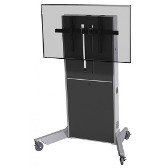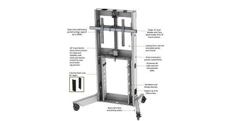 The LFT7000 is a heavy duty, mobile & height adjustable stand with multiple display mount options. It is a self-supporting wheeled stand. Ideal for environments where adjustable height or ADA is required. Internally it features vertical 3U rack rails behind the bottom locking panel. Cable channel