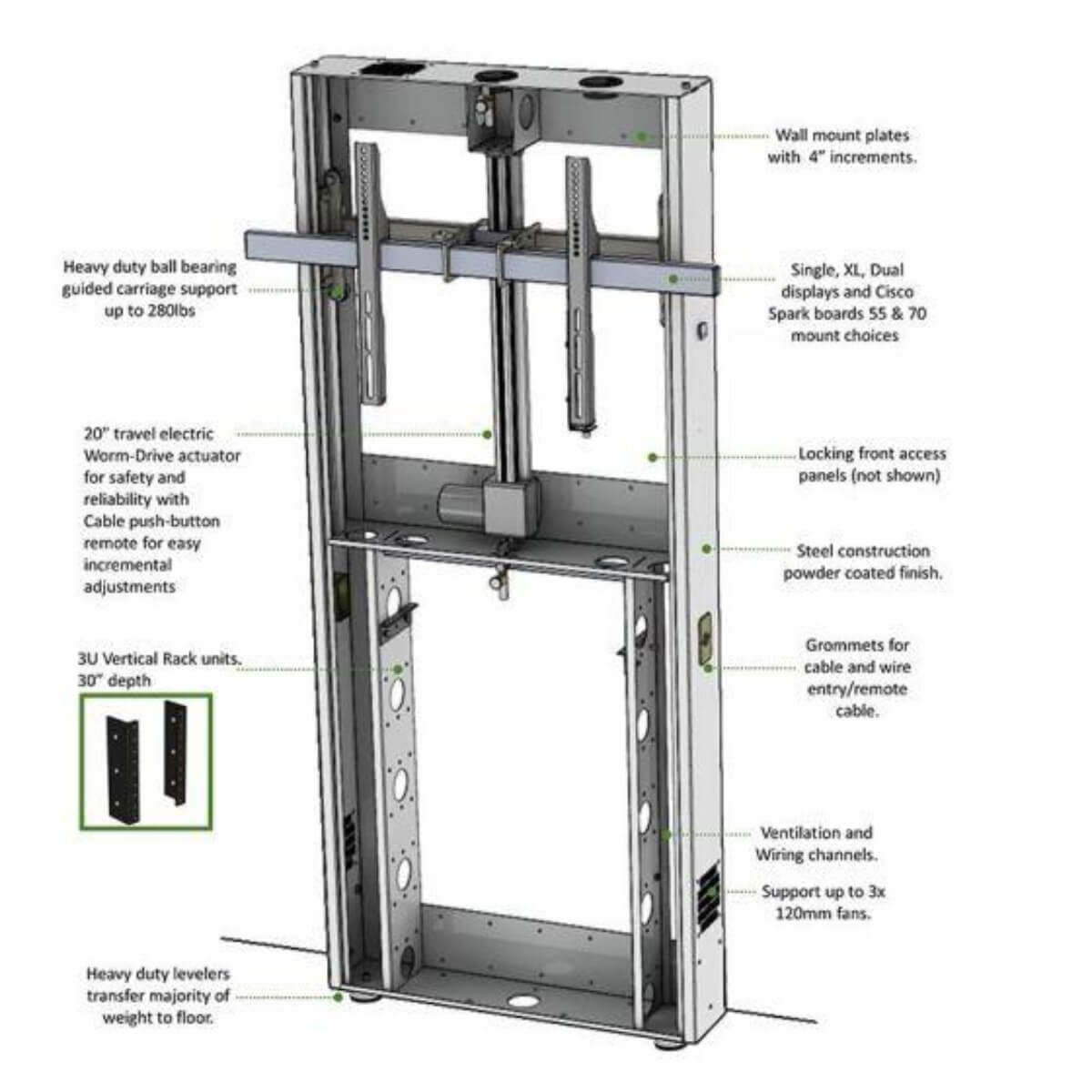 Internally it features vertical 3U rack rails behind the bottom locking panel. Cable channel and ventilation. Supports displays weight up to 280 lbs. Requires fastening to stud or masonry wall.