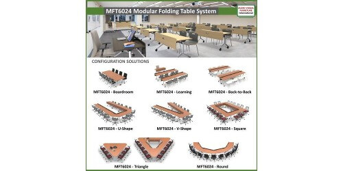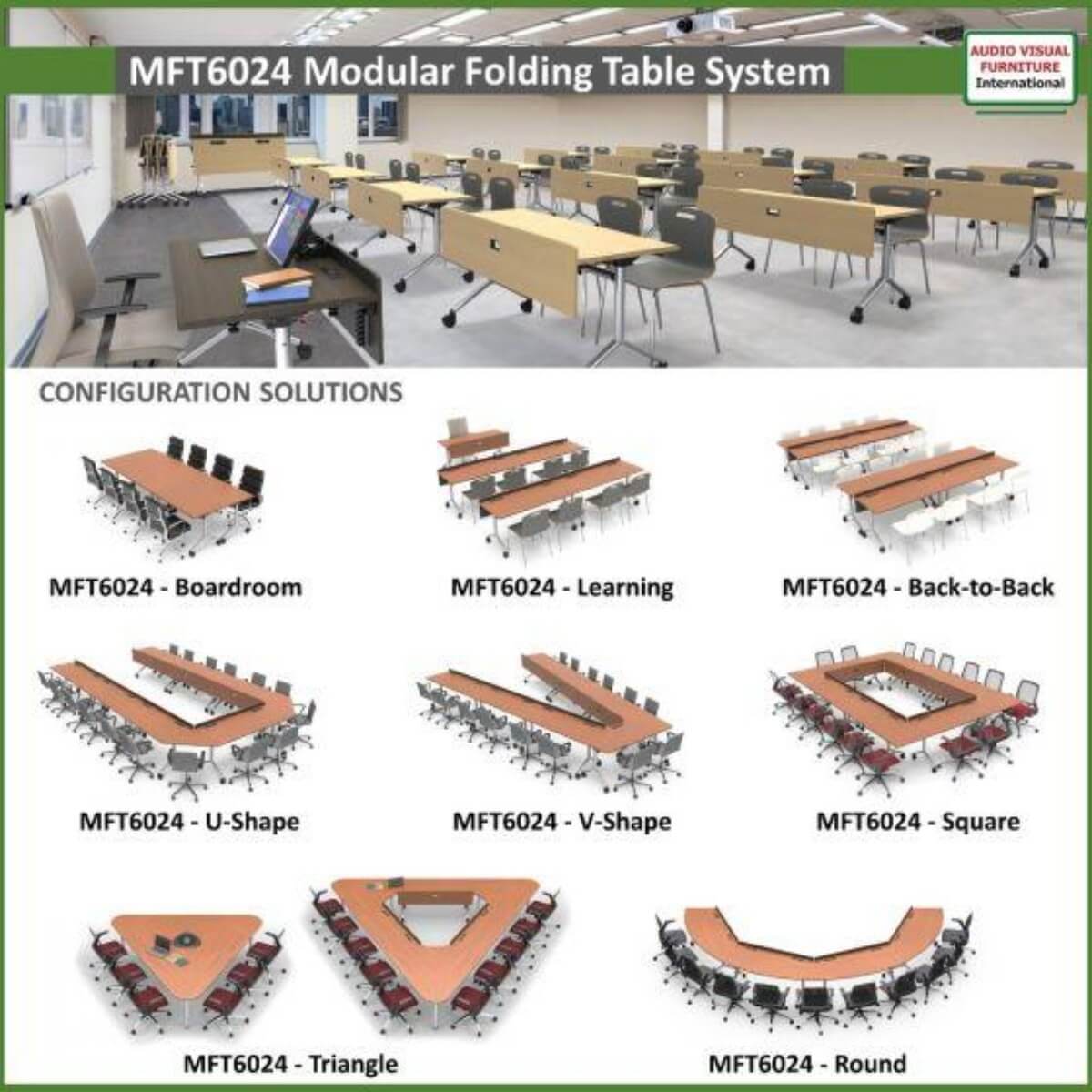 The Modular Folding Table System MFT6024 is a training and conference room solution for both professional and private bureaus. AVFI"s unique design incorporates hardware with an Intelligent Folding System that allows the tables to be mobile, linked together and easily folded for storage. Several sizes and shapes are available for modular room layouts and configurations, suitable for conference and training room areas.
