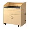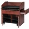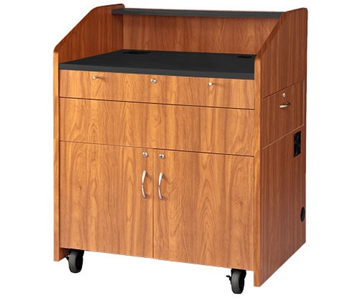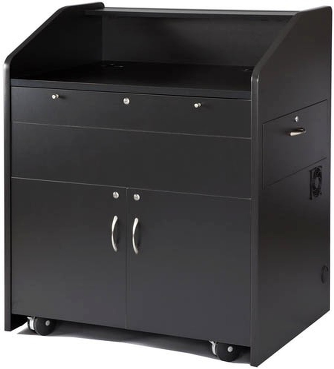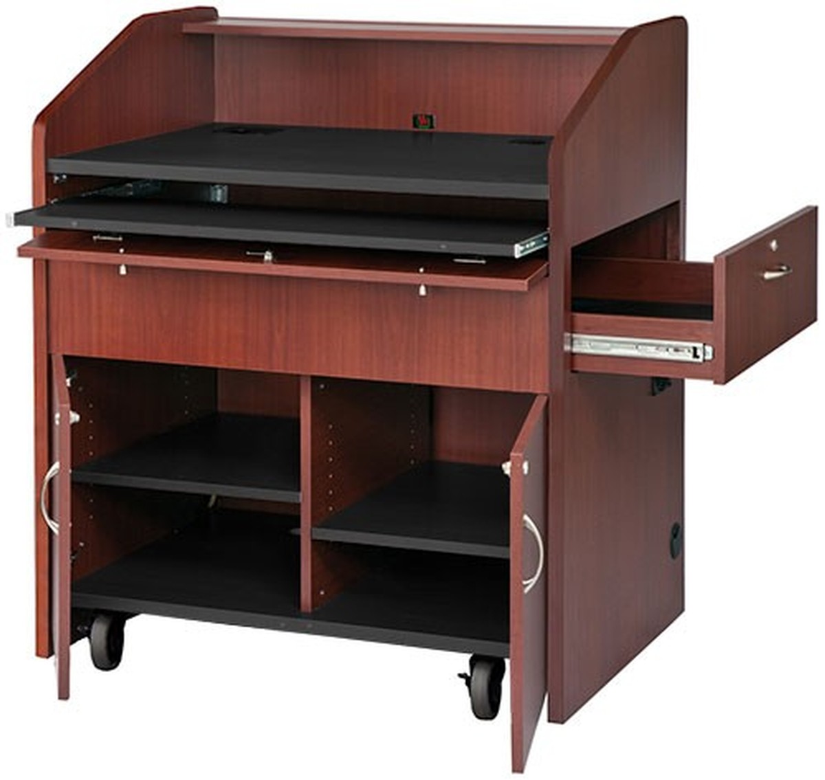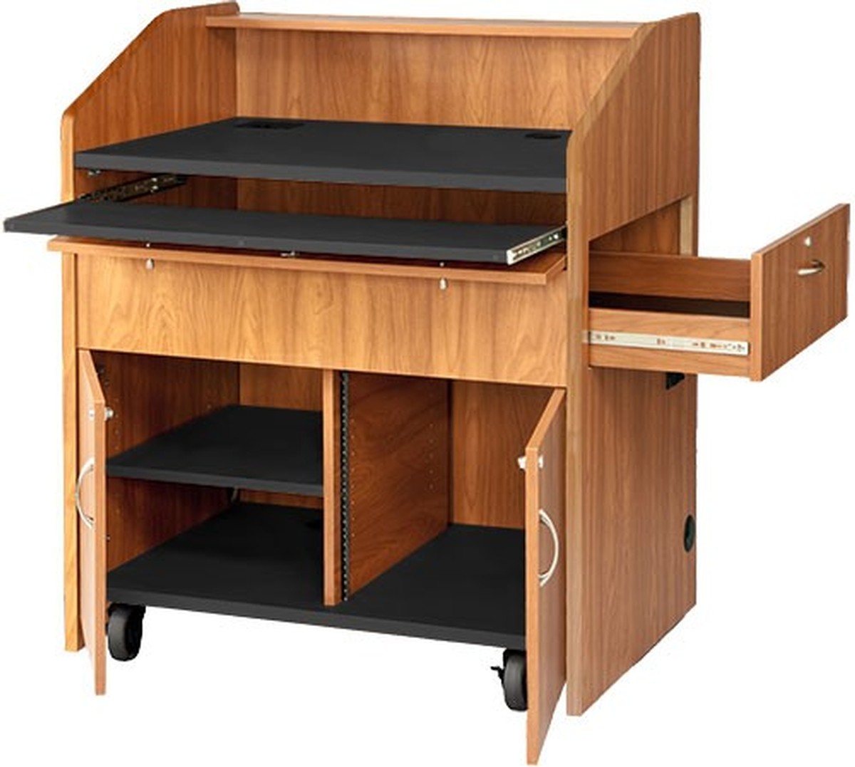 The AVF PD3002 is a rolling podium with roomy countertop and storage space, it features a full size pull out side shelf and slide out keyboard tray. What sets this unit apart is the 10RU rack behind the front right door, and the ample storage room and computer room behind the left door. Also included is a 2 locking front, 2 rear, 1 keyboard, and 1 pull out side shelf door to keep all your equipment hidden and provide a nice clean look. The PD3002 comes in 10 different high quality furniture grade 3 millimeter thick laminate colors to meet the desired look in your room, choose from maple, bartlett pearwood, Brazilian walnut, soprano, aria, baroque, cherry hill plank, white, storm, and black.