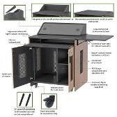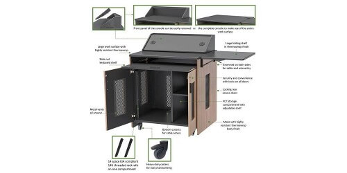 The roll-about multimedia podiums are the ideal solution for distance education, electronic classrooms and corporate training sites. Model PD51 features a large customizable top surface to support monitors, laptops and room control systems. Special Feature: Console can be dismounted to make use of the entire work surface. Front panel of the console can be easily removed as well from a wedge position, while maintaining the privacy of your presentation