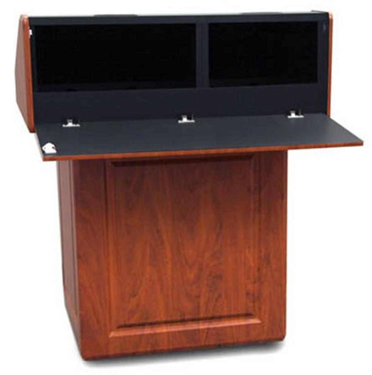 The podiums top work surface size is 39.5" wide by 14.25" deep, the keyboard space is 29" wide by 5 7/8" high. Underneath is a 19" wide 12RU rack and space for a computer, the computer space is 8 1/8" wide by 21 1/8" high. Also on top are removable pods, they allow you to custom integrate any electronics needed right in the podium. The left pod is 22.5" wide by 28 5/8" deep, the right pod is 17" wide by 28 5/8" deep.