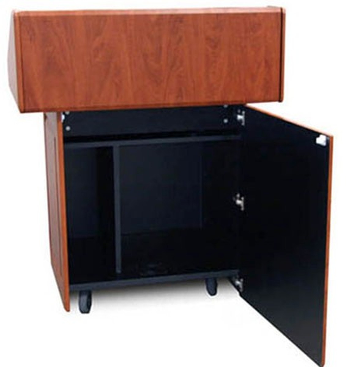 The AVF PDX22 is a podium on heavy duty casters that allows it to be mobile, it features a drop front keyboard slide, and 12RU rack mount. The front main door and keyboard door lock to keep all your equipment hidden and provide a nice clean look. The back side or the side that the audience sees features no visable hardware, however the doors do open with a special magnetic catch. This provides the cleanest look possible with the convenience of being able to get to the back of your equipment. The PDX22 comes in 12 different high quality surf(x) 3D laminate colors to meet the desired look in your room, this laminate is thermo pressed on so there are no edges to be found. Choose from auburn pear, river cherry, clove, crossfire java, elegance, crystal white, brushed aluminum, ebony, maple, aria, baroque, and shark gray.