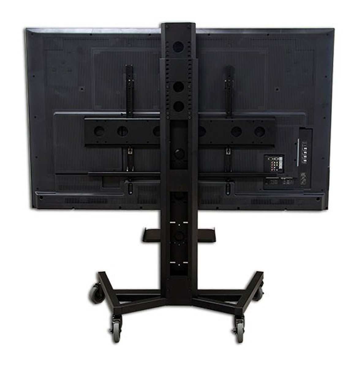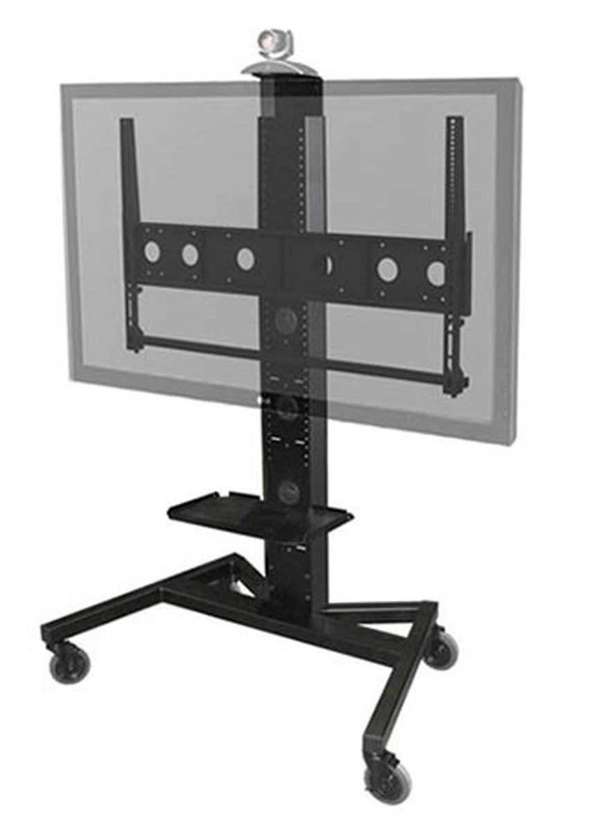 The AVF PM-XFL-S is a rolling TV stand for a 50" to 90" monitor, it also includes a 6 position adjustable shelf. The stand can hold up to a 90" display with a max Vesa pattern of 1100mm wide and 650mm high, and weighing 265lbs. The shelf can be used to hold anything that you need on the go such as a BluRay player, there is also an adjustable height camera shelf so you can use the setup as a VTC stand. The stand is easy to roll with the heavy duty 5" casters, 2 are locking and all are non marking. The stand is made of incredible strong 11 gauge steel and the base is a high quality tube construction that will not make the stand feel wobbly.