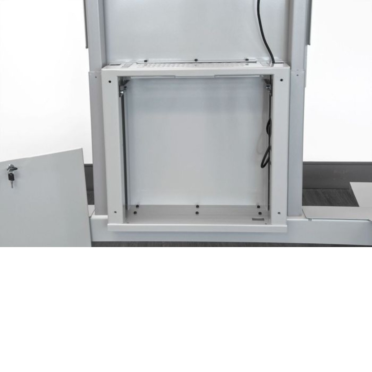 Its unique design is ideal for environments where adjustable height or ADA is required, creating accessibility to technology in classrooms and corporate environments. It features rear lockable compartment for storage or 3U racking space with cable channel and ventilation.