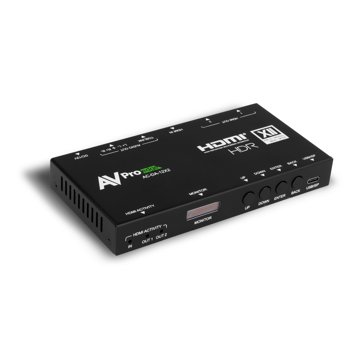 AC-DA-12X2 is an AVPro Edge one-input to two-output, 48 Gbps HDMI 2.1b distribution amplifier that flawlessly divides incoming HDMI signals up to 8K/60 fps into two separate output streams. Current 8K media consoles or 4K sources pass through HDMI 1 to a capable display, while downscaling may be enabled to allow HDMI Output #2 to lower output resolution for compatibility with legacy display devices, particularly projectors. Another everyday AC-DA-12X2 use is sending HDMI Out #2 signal into legacy AVRs whose dated HDMI circuitry limits video connectivity while audio-wise, 3D immersive format decoding remains viable, enabling the audio playback device to continue operational for as long as required. Additional features such as extensive EDID management, extracted audio, and USB setup capability make the AC-DA-12X2 perfect for use by residential and commercial integrators whenever mixed-use systems pose installation challenges.