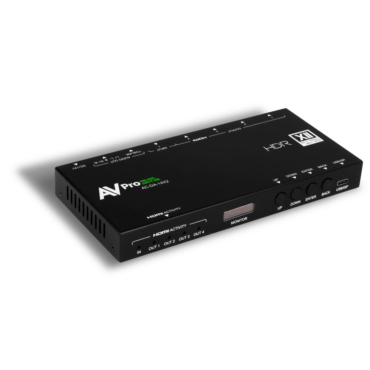 The AVPro Edge AC-DA-14X2 is a one-input to four-output, 48 Gbps HDMI 2.1b distribution amplifier that flawlessly divides incoming HDMI signals up to 8K/60 fps into four separate output streams.