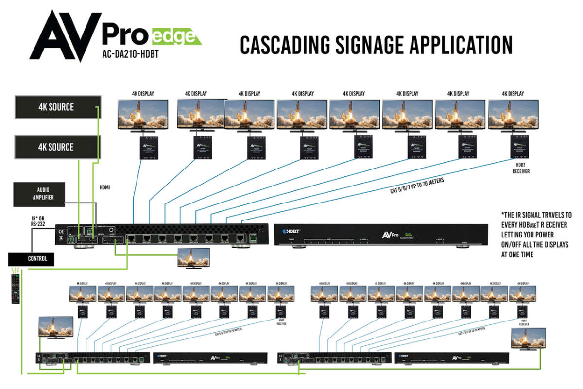 The AC-DA210-HDBT is a true plug-and-play device that even has the option/ability for cascading & switching over multiple layers. Controls are both intuitive and user friendly though RS-232 and IR you can manage your end points as well for things like power on/off. Additionally, these have two switchable inputs making for more robust systems. The dual HDMI outputs allow you to expand the switching virtually forever. A device that was truly designed for cascading, that will allow for a hassle free setup during several "hops", this model even features a cascade mode, that allows for additional devices to be added (cascaded) in true plug-and-play style and with the 2 HDMI outputs you can maintain the 2 input switching across a massive cascaded system.