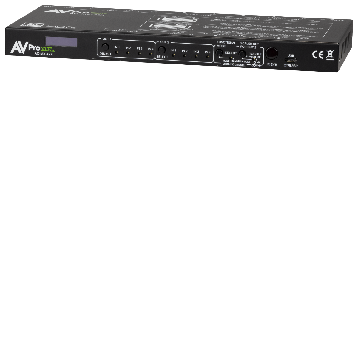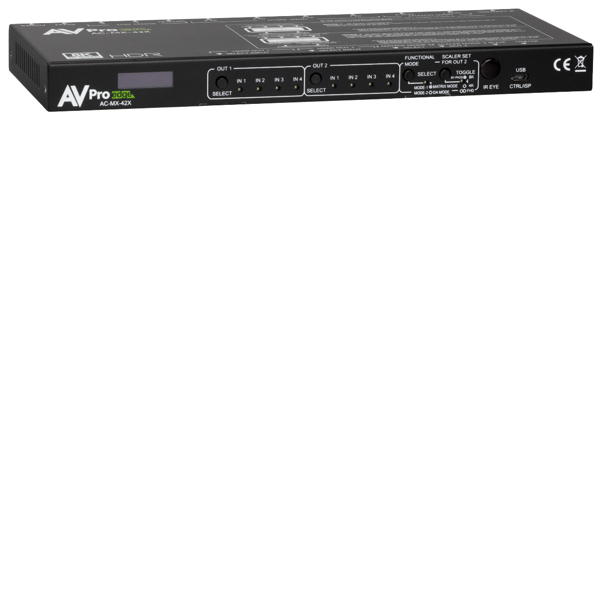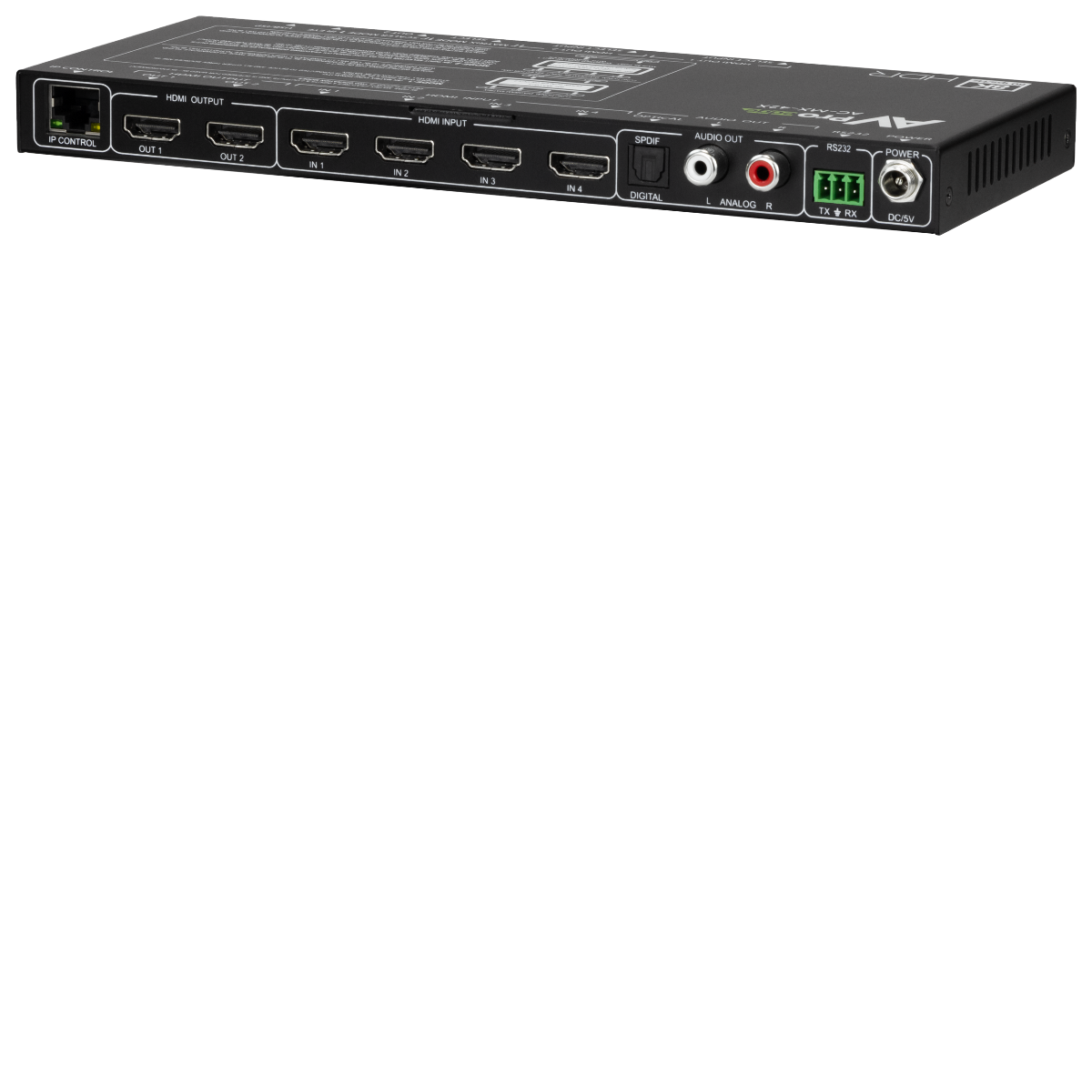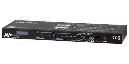 The AVPro Edge AC-MX-42X is a four input by dual output HDMI matrix switcher. It supports HDMI 2.1, HDCP 2.3, and up to 8K video resolution with 40Gbps bandwidth capacity. This matrix switcher is perfect for working with the latest gaming consoles, streaming devices, and satellite receivers, connecting them to 8K TVs and projectors. In addition, this matrix equalizes and amplifies the output to ensure HDMI signals will transmit through long HDMI cables without loss of quality.