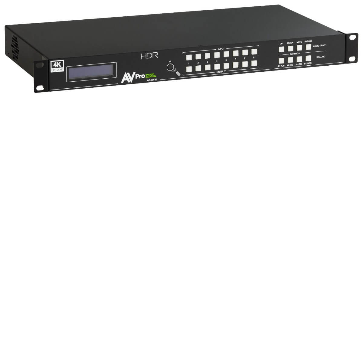 The AC-MX-88 is an 8x8 HDMI matrix switch that supports HDMI 2.0(a/b), HDCP 2.3, up to 4K video resolution, and up to 18 Gbps bandwidth. This switch allows any source (Blu-ray, UHD Blu-ray, satellite receiver, game consoles, PCs, etc ... ) to show on any connected displays. This matrix equalizes and amplifies the output to ensure the HDMI signal transmits through long HDMI cables without losing quality.Audio Delay is “On-Board” so integrators can manage lip-sync issues before they become a problem. Video signal management is also possible with built-in scalers. So, if the installation has a couple of older displays, integrators don’t need to forfeit 4K signals to pass the signal to all of the displays. In addition to scalers, this matrix supports complete EDID management, allowing maximum flexibility with today’s broad mixture of sources and displays.