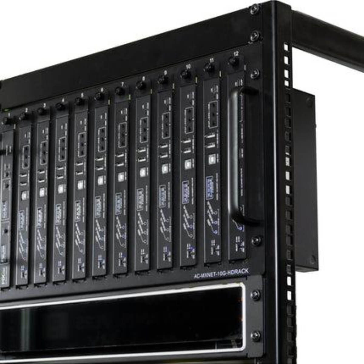 Optimize your AV installation with the MXnet 10G Heavy Duty Rack, a robust and efficient solution designed to fit up to 12 SDVoE Transceivers in a compact 6 rack unit (RU) space. This meticulously engineered rack system ensures a clean, organized, and professional setup, allowing you to mount all your transceivers and a control box seamlessly.