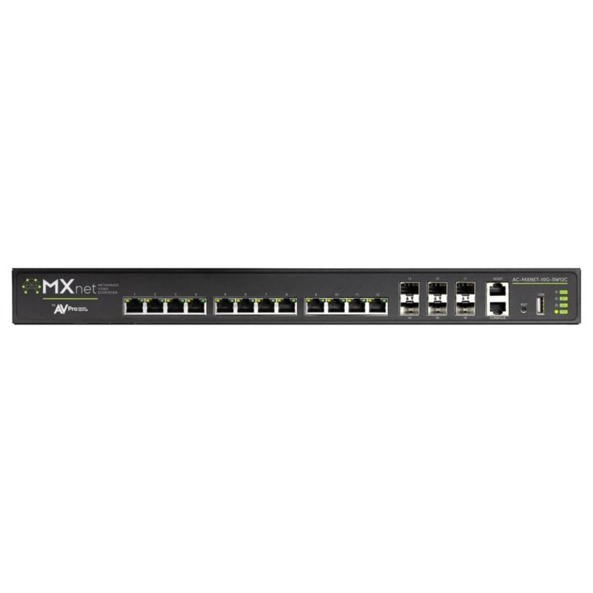The AC-MXNET-10G-SW12C is an AVPro Edge designed managed switch for high-density 10G communication and seamless integration with the MXNET 10G ecosystem, representing the next step forward on the evolutionary path of the MXNet platform. Encompassing an industry-first, holistically integrated approach to AV over IP video distribution from a solo manufacturer, AVPro Edge’s exclusive MXNet 10G platform offers the only proprietary, hyper-optimized SDVoE ecosystem of network-based managed switches, encoders and decoders guided from a centralized control unit via MXNet Mentor, our in-house engineered setup and system utilities management web application solution.AVPro Edge is the first manufacturer of encoders and decoders to also manufacture Plug-and-Play, preconfigured network switches for all AV-over-IP applications.?Switch management through AC-MXNET-10G-CBOX's proprietary AVPro Edge Mentor, including VLAN, real-time bandwidth appropriation, and comprehensive system diagnostics to quickly identify and illustrate port connections. Mentor also provides detailed multicast information. The AC-MXNET-10G-SW12C is an industry-first design to traffic both data and PoE through 12 common ports - a single CAT-6a is all that is required to provide power plus data. Onboard are six, 10G/25G SFP28 uplink ports, which are backward compatible with SFP+ ports to function with SFP+ optical modules or SFP+ DAC cables (please note: the 25Gbps data rate is not supported). These ports can be used to connect up to six, MXNET-10G TCVR SDVoE transceivers.
