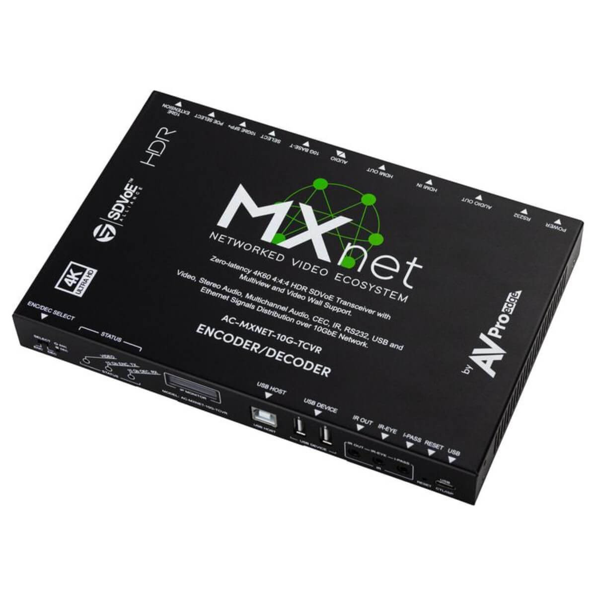 AC-MXNET-10G-TCVR, a single SKU, dual-use configurable, advanced modular AV-over-IP encoding / decoding IP streaming solution. Whether deployed as a transmitter (Encoder) or receiver (Decoder), AVPro Edge has cultivated multiple advanced concepts into this device. The new AC-MXNET-10G-TCVR serves as both a gateway and destination point for the 10G lineup of AV-over-IP multicast offerings from AVPro Edge.The following details will assist in getting you acquainted with this device: Maximum range up to 100 meters using a single twisted pair Cat6a cable (40m/Cat5e, 55m/Cat6)Maximum range up to 18.6 miles using single-mode fiber, through industry standard SFP+ modulesSystem scalability limited only by available switch portsZero frame latency, zero image artifacts, zero compression up to 4K/30fps 4:4:4 8-bit.HDMI 4K/60fps 4:4:4 8-bit (100µs frame latency, or 1/150th of a frame); 4K/60fps 4:2:2 10-bit, and 4K/60fps 4:2:0 12-bit, are transported visually lossless with a pixel-perfect light compression of 1.3:1Data packetization at encoding enables pixel-perfect transport and decoding for artifact-free, crystal clear imagesFull Dolby Vision, HDR10, HDR10+, HLG, and IMAX Enhanced supportAuto Color Space cross-conversion for RGB sources (full API adjustability at any point in the signal chain)Fast Switching, with Upscaling to 4K or Downscaling from 4K supported when operating in Decoder modeSoftware-defined MultiView with Simple Grid, Hybrid Grid, Window Tiling, Picture-In-Picture (PIP) and Picture-And-Picture (PAP), plus arbitrary customized layouts available at any endpoint requiring no additional equipmentVideo wall configurations feature bezel correction and asymmetric wall support, for wall arrays up to 8 x 8.HDMI embedded audio pass-through for up to 8 channels LPCM with up to 24-bit depth and 192kHz sampling rate, including support for Dolby Atmos and DTS:X. Independent routing with breakaway for: de-embedded HDMI audio (8 ch / LPCM/ 192/24) and 2-ch / Downmixed de-embedded HDMI audio. Analog stereo audio (up to 24-bit / 48 kHz sampling rate) may be extracted Bidirectional Control for: IR; RS-232; USB HID; Ethernet 1Gbps USB-B Host connection and KVM ControlTwo units may be paired as Point-to-Point extenders outside of a 10Gbps networkThird-party control and MXNet-10G Mentor WEB GUI via AC-MXNET-10G-CBOXAudio, Video and Control signals reside on autonomously isolated layers within the SDVoE platform, each independently routable for unparalleled flexibility with flawless distribution over a 10GbE copper, fiber, or hybrid-blended network. A built-in, segregated, 1GbE Ethernet w/PoE full gigabit sub-network channel is reserved for high-speed local network connections.When selected for transmitter mode, an AC-MXNET-10G-TCVR sends content from a connected source, via multicasting, to individual or multiple endpoints on the network. In contrast, traditional A/V distribution layouts such as HDBaseT and HDMI anchor a matrix switcher, forcing source localization into the rack environment.Presently, a physical HDMI matrix in a low distance application (one-on-one, point-to-point connections with displays, via NextGen Active Optical HDMI cables) will provide the best video performance for all possible sources, such as 4K/120fps game consoles. With commercial applications such as those industrial or perhaps campus-related, untethered sources injected into a network by an AC-MXNET-10G-TCVR from decentralized locations represents the ultimate in system design freedom and deployment ease. Sources may be set for their highest capabilities (up to 4K/60fps) and the MXNET ecosystem diligently handles all details.Configured for decoder mode, an AC-MXNET-10G-TCVR transforms into a technical tour de force in every conceivable way. Connected to a display, AC-MXNET-10G-TCVR memorizes the display’s EDID while automatically adjusting colorspace (colorspace cross-conversion from RGB to YUV when necessary) for all source devices, computers, or streamed video. Any version of HDR metadata is passed-through to HDR-capable displays, while being blocked automatically from SDR displays. Onboard scaling for no-wait, rapid switching also provides MultiView compositing, available on any display type. Video wall arrays are easily configured using built-in, advanced software bezel correction.The MXNET-10G ecosystem supports concurrent system matrixing, MultiView, and Video Wall operation, while independently routing audio, video, control or USB HID signals. Twisted-pair copper, fiber, and hybrid system connectivity is supported, whether the device is commissioned as encoder or decoder. MXNET-10G Mentor access, via the AC- MXNET-10G-CBOX, enables rapid API system configuration changes, with the front-facing OLED display providing eye-glance quick system monitoring.Key Benefits For Using The AC-MXNET-10G-TCVR The Matrix Transformed - AVPro Edge is a contributing member company in the SDVoE Alliance, the next generation of AV-over-IP. The MXNet-10G ecosystem of controller, transceiver and switches represents an entirely new approach to AV system design at an unconstrained scale. Signal distance is essentially eliminated as a deciding factor in product selection or for utilizing system features.?The AC-MXNET-10G-TCVR is perhaps the pivotal MXNet-10G ecosystem component performing dual heavy lifting, easily selectable from the front panel. As an Encoder-Transmitter, the AC-MXNET-10G-TCVR transcends traditional matrices by eliminating physical limitations such as input availability and source location, or stipulations with source format. The encoded source signal is “packetized”, then transported across the network to AC-MXNET-10G-TCVR units configured as decoder-receivers. The number of devices is limited only by the number of available switch ports. Genlock Mode – Video signals transported through the MXNet-10G ecosystem are either uncompressed or use visually lossless, pixel-perfect imperceptible light compression. In missi